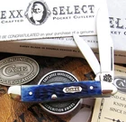 Hi I'm James Parker and I am offering some knives for auction from a fine Case Knife Collection acquisition out of Georgetown, Kentucky. The winning bidder pays $5.95 for USPS Ground Advantage Shipping with Delivery Confirmation included in the Shipping price. This knife for auction is a 1998 issue Case Select Peanut, 2 7/8" closed, featuring the great looking Case "Rogers" Jigged Blue Bone (cattle bone) handles and nickel silver components. This Case Select Peanut originally sold for $59.99 at the few Case Select retailers who were allocated this knife in 1998 - 1999. The master Clip blade is stamped on the front tang with Case XX Select, while the rear tang of this blade is pattern stamped with USA 6220 SS. Both blades have half stops and great "walk and talk" snap. This Case Select Peanut is manufactured with the all nickel silver components. The pins, liners, shield, and bolsters are all composed of nickel silver. This is a desirable feature that Case incorporates into the Case Select Series Knives. Please be sure to see all 5 of the Supersize Photos as this is the EXACT knife the winning bidder will receive. The original carrying pouch is also included - it is in the Case Select box. The Case item number is #02414. This spectacular 1998 issue Case Select Peanut is mint condition in the original issue Case Select factory box with the original Case Select factory brochure and the original older style Case factory paperwork brochure and is being offered at No Reserve. Thanks for your bids, we appreciate it.