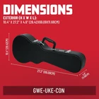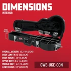 ’s GWE-UKE-CON ukulele case provides a durable, hard-shell, lightweight solution strong enough to withstand daily use for your concert style ukulele. The series is built from heavy-duty plywood wrapped in a rugged Tolex PVC plastic providing a safe, moisture resistant home for your ukulele. The form-fitting interior cradles your instrument while the plush lining keeps it safe from dust and debris. A built-in storage compartment provides ample storage for picks, tuners, and accessories and doubles as extra support for the delicate neck and headstock. Traveling with your ukulele is effortless with the ergonomic handle and chrome plated, lockable latches keeping everything safe and secure Designed to fit Concert Size Ukuleles Ultra‐durable plywood construction with Black Telex PVC covering stands up to years of use and abuse Ergonomic handle offers a comfortable grip, perfectly balancing the weight of your instrument Thick plush lining keeps your guitar cushioned against impact and a spacious interior accessory compartment organizes all your favorite accessories Interior Dimensions: Body Length: 13" Body Height: 3.5" Lower Bout Width: 8.5" Middle Bout Width: 5.8" Upper Bout Width: 6.3" Overall Length: 25.3"