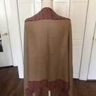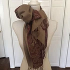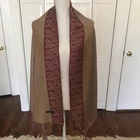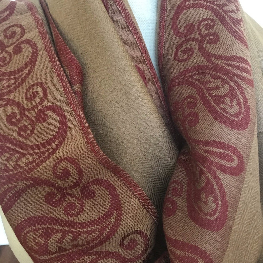 Absolutely new delicate cashmere scarf / wrap in toffee brown with cherry color border. Paisley print. 66”x 28” size w/o fringe.