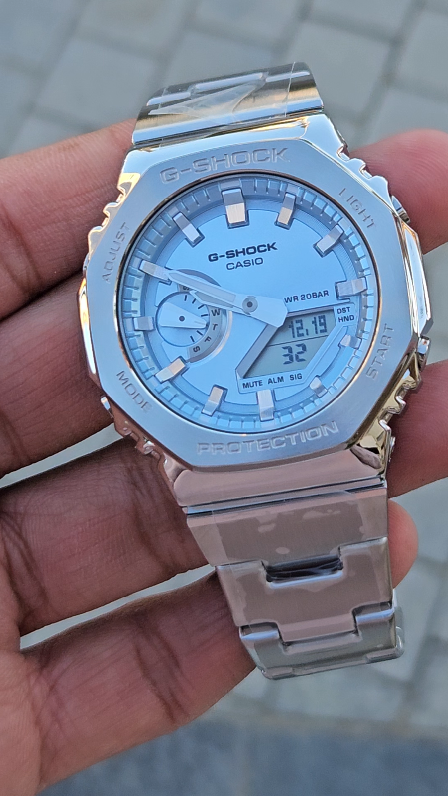 Brand: Casio Model: G-SHOCK GM-2110D-2A Series: G-SHOCK Octagon Condition: Brand New with Tags Gender: Men's Dial Color: Ice Blue Display: Analog-Digital Case Material: Stainless Steel Band Material: Stainless Steel Water Resistance: 200 meters / 20 Bar Features: Shock Resistant World Time Stopwatch Countdown Timer 5 Daily Alarms Full Auto Calendar LED Light with Afterglow Hand Shift Feature Mute Function This model combines the iconic octagonal G-SHOCK shape with a stylish stainless steel bezel and a fresh light blue dial. Perfect for both casual and formal wear. Comes in original box with manual and warranty card.
