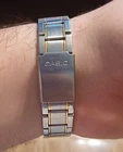 This is a Casio men's wristwatch with a silver case, black dial, and a steel band featuring both gold and silver colors. It is a quartz movement watch with a 12-hour dial, designed for casual wear. The band material is steel, making it durable and stylish for everyday use.