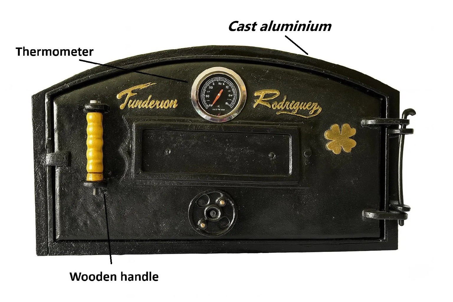 ✅ Description Upgrade your clay oven with this cast aluminum door , combining durability and heat efficiency with a stylish design. Featuring a built-in thermometer , it ensures accurate cooking temperatures for your favorite recipes. Perfect for wood-fired ovens and outdoor kitchens, this oven door delivers strength, longevity, and performance in every use. Specifications: Material: Cast Aluminum Color: Black Dimensions: 26.77" W x 16.14" H x 4" D Features: Thermometer, Heat-Resistant Construction ✅ Highlights Clay oven door made of durable cast aluminum for lightweight strength Includes built-in thermometer for accurate temperature control Designed for wood-fired ovens , retains heat effectively Rustic style adds a traditional look to your outdoor kitchen Size: 26.77" W x 16.14" H