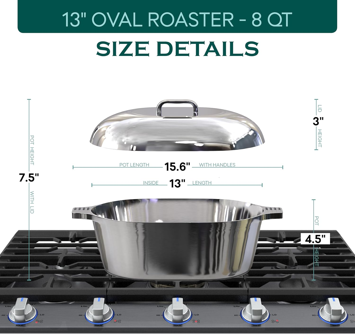 Store New Arrivals Add to Favorite View Feedback Contact Cast Aluminum Oval Dutch Oven with Lid — 8 QT Heavy Duty Roaster Pan with Rack & Silicone Cover Dual Handles — Cajun Cookware for Roasting, Baking, Cooking (13" Medium) Description Item model number OVAL-18 Capacity 8 Quarts Temperature Rating 500 Degrees Fahrenheit Color Aluminum Product Dimensions 15.75"W x 8"H Material Aluminum Is Dishwasher Safe Yes Item Weight 8.29 pounds Is Oven Safe Yes Shape Oval With Lid Yes Lid Material Aluminum Manufacturer Magnaware Finish Type Polished Aluminum Finish Brand MAGNAWARE Product Care Instructions Hand Wash Only Size 13 Inch (Medium) SUPERIOR HEAT DISTRIBUTION: Crafted from premium cast aluminum, this dutch oven ensures even heat distribution, delivering consistently perfect meals. Ideal as an aluminum roaster pan for braising, roasting, baking, and preparing flavorful stews with precision. LIGHTWEIGHT & RUSTPROOF ADVANTAGE: Unlike traditional cast iron cookware, this lightweight dutch oven is rust-resistant and maintenance-free, requiring no seasoning. Enjoy effortless handling, cleaning, and care without sacrificing durability or performance. Compatible with gas, electric, ceramic, and glass stovetops; induction compatibility requires an adapter plate. BUILT TO LAST GENERATIONS: Constructed for durability, this heavy-duty cast aluminum pot is oven safe up to 450°F. MAGNAWARE dutch ovens feature a classic polished aluminum finish that complements any kitchen aesthetic. For best results, simply use a small amount of oil, and to preserve the surface, we recommend silicone, wood, or nylon utensils over metal ones. DESIGNED FOR ALL CULINARY NEEDS: Available in four sizes — including 11" Small, 13" Medium, 15" Large, and 18" X-Large — this oval Dutch oven pot with lid caters to various family sizes and cooking preferences. Each set includes protective silicone handle covers and a stainless steel roasting rack for added convenience. CAJUN COOKING & BEYOND: A true kitchen workhorse, this cast aluminum dutch oven is perfect for Cajun favorites like gumbo and jambalaya, baking artisan bread, simmering hearty soups, and preparing delicious casseroles. Its tight-fitting lid effectively seals in moisture and flavors, enhancing the taste of your meals. Product description The cast aluminum oval Dutch Oven features rapid and even heat distribution, ensuring swift heat transfer to the side walls and the top. Its design enables you to achieve superb cooking results. The oval Dutch Oven features a beautiful mirrored polished exterior, showcasing a sleek retro style. Make a solid statement with this elegant and functional culinary essential. Our cast aluminum oval Dutch Oven features heavy-duty, durable construction designed to withstand the test of time. It meets professional standards, promising satisfying cooking experiences for years. Unlike cast iron, it requires no seasoning, ensuring a low-maintenance cooking companion. It is also rust-resistant, removing the need to worry about its appearance. ABOUT US We offer the best prices around on high quality products. Our E-store includes media such as books, movies, music and games while offering electronics, toys, sporting apparel, clothing, tools, general home, garden items and more. SHIPPING We are always working hard to ensure your package arrives as soon as possible. Please understand that some factors like weather, high postal traffic, and the performance of shipping companies are outside of our control. RETURNS We offer a 30-Day Return Policy on items which you are not completely satisfied with. You have the option for a full-refund or an exchange of the item. No returns are available on items shipped outside of the USA. PAYMENT We accept PayPal. CONTACT US This page content is yet to come Please ad us to your favorite seller and visit again later Thank You CUSTOMER SATISFACTION We try our very best to make sure every customer is completely satisfied. If there's a problem, message us! We're happy to help. WE ACCEPT Copyright © 2021 AutoDS. | All Rights Reserved