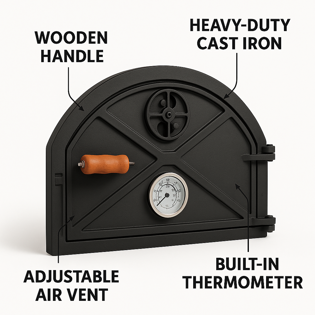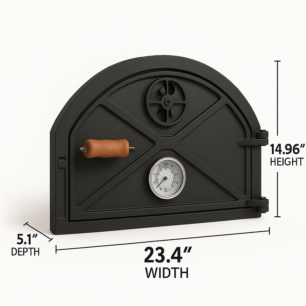 ✅ Description Upgrade your outdoor cooking experience with this cast iron oven door , specially designed for wood-fired ovens. Featuring a built-in thermometer and left-side wooden handle , it combines durability with functionality for perfect cooking results. Ideal for BBQ enthusiasts and outdoor kitchens, this door is crafted to withstand high heat and last for years. Specifications: Brand: Sor Pampa Grill Material: Cast Iron Color: Black Dimensions: 5.1" D x 23.4" W x 14.96" H Features: Thermometer, Vent, Left Handle ✅ Bullet Points (Highlights) Heavy-duty cast iron oven door with built-in thermometer Perfect for wood-fired cooking , retains heat for better baking Convenient left handle for easy access and control Durable, heat-resistant construction for long-term use Size: 23.4" W x 14.96" H x 5.1" D