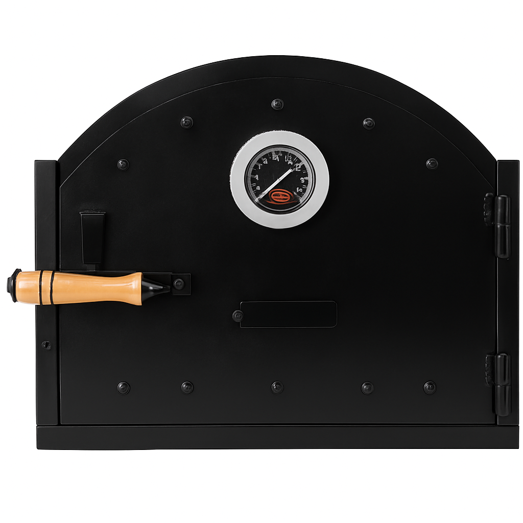 ✅ Description Upgrade your wood-fired pizza oven with this heavy-duty cast iron oven door featuring a built-in thermometer and ergonomic wooden handle . Perfect for maintaining heat and achieving authentic pizza flavors. Durable and stylish, this door ensures even heat retention and cooking precision for your oven. ✅ Key Features ✔ High-Quality Cast Iron – Exceptional durability and heat retention ✔ Integrated Thermometer – Monitor temperature for perfect cooking ✔ Ergonomic Wooden Handle – Safe and comfortable grip ✔ Large Size – 21,7" W x 14" H, fits most traditional pizza ovens ✔ Rustic Black Finish – Complements any outdoor cooking setup ✅ Dimensions & Specs Width: 21,7" (Inches) Height: 14" (Inches) Depth: 3" (Inches) Weight: 31 lbs Material: Cast Iron Color: Black