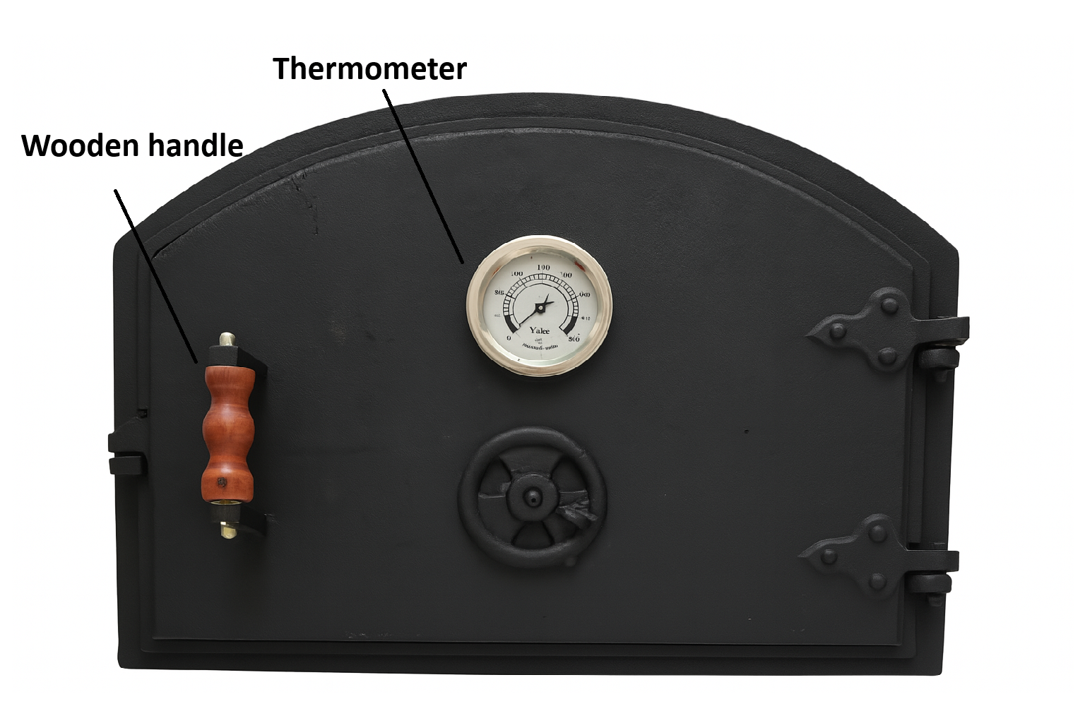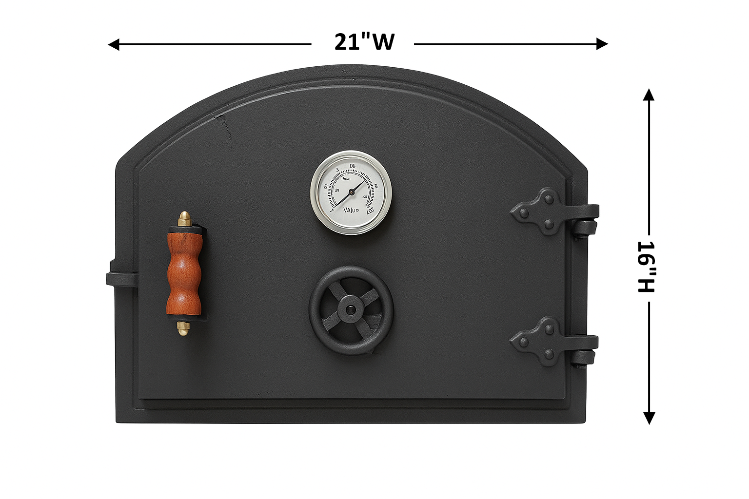 ✅ Description Enhance your outdoor cooking setup with this Cast Iron Pizza Oven Door , featuring a built-in thermometer for accurate heat monitoring. Perfect for wood-fired ovens, this heavy-duty door ensures excellent heat retention and durability. With its classic design, wooden handle, and vent control , it’s an ideal addition for pizza lovers and outdoor cooking enthusiasts. Specifications: Material: Cast Iron Color: Black Heating Method: Conduction Fuel Type: Wood / Charcoal Dimensions: 4" D x 21" W x 16" H Weight: 42 lbs ✅ Highlights Premium cast iron pizza oven door with thermometer for temperature control Perfect for wood-fired & charcoal ovens , retaining heat for even cooking Rustic design with wood handle & adjustable vent Heavy-duty construction for outdoor kitchens & BBQ setups Size: 21" W x 16" H