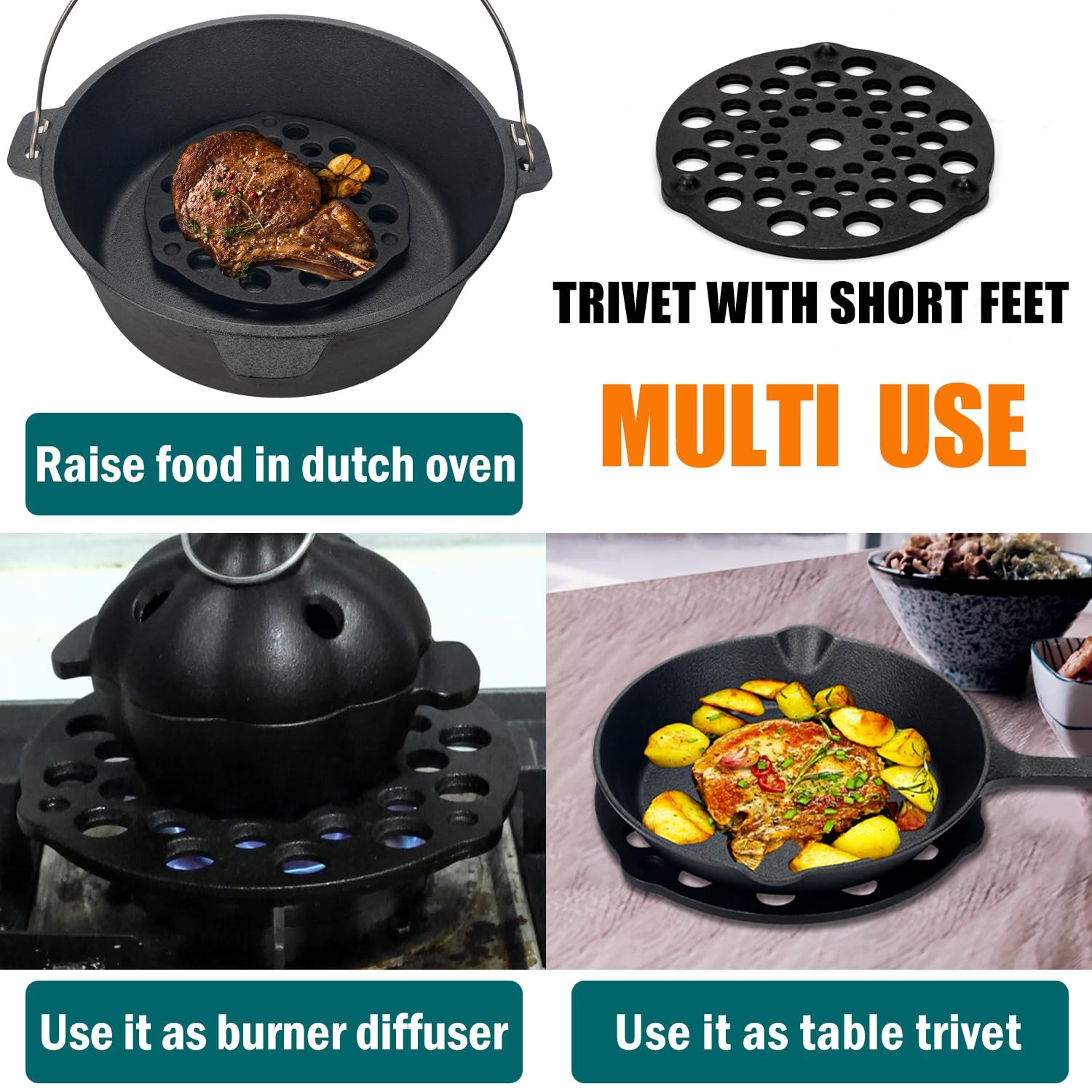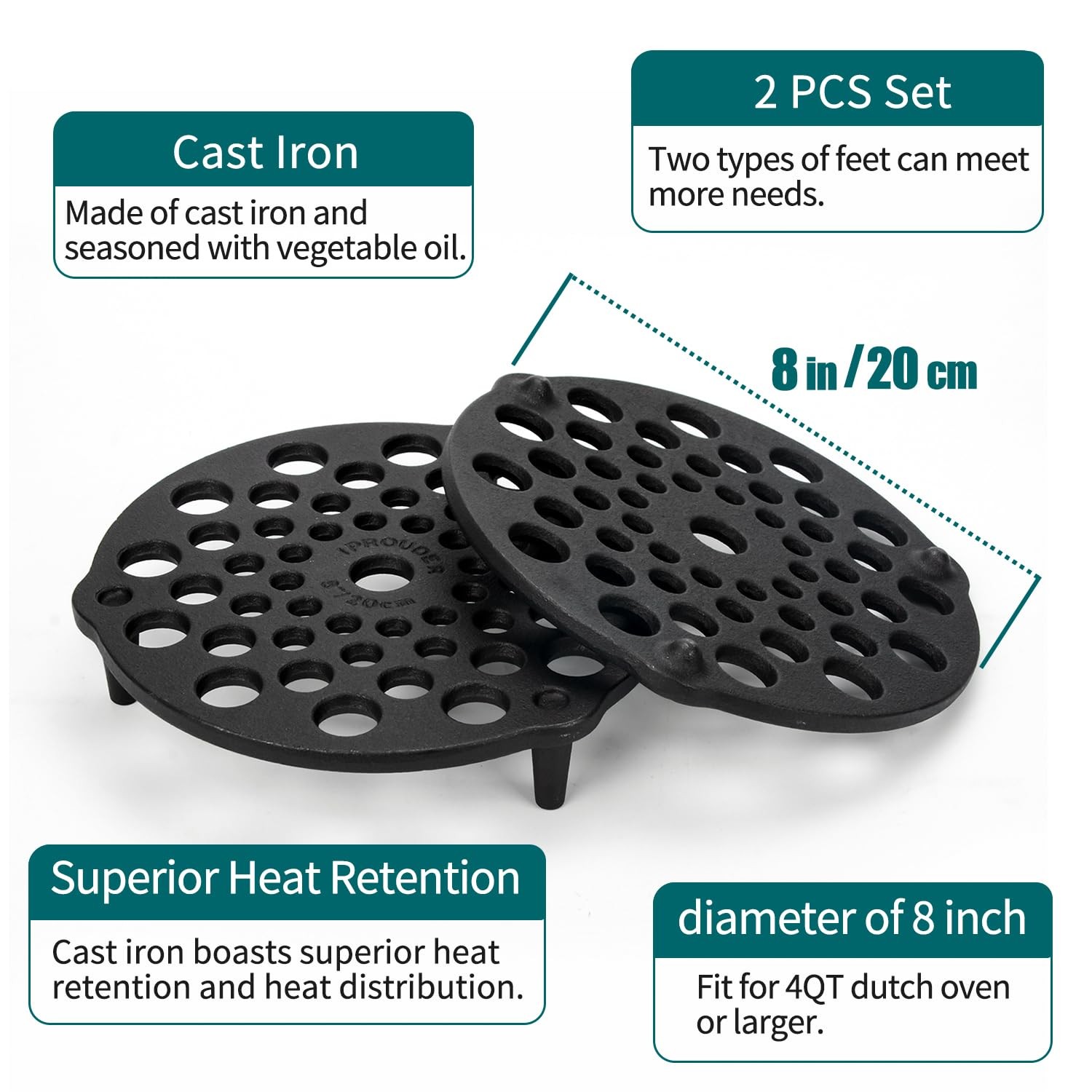 Cast Iron Grate for Dutch Ovens 2 PCS SET/Pre-seaoned Cast Iron Meat Rack/Cast Iron Trivet Made of cast iron and seasoned with natural vegetable oil. Excellent in heat retention and even heating Raises meats, sourdough bread, pies, and other foods off pan bottom to prevent scorching in dutch ovens. Fit for 4 quarts cast iron dutch ovens or larger For the Cast Iron Grate with long feet, you can used it directly in embers,and cook your food. You can also stack multiple grates to cook food .Or you place the Grate in the fire and use it as a surface for putting down Dutch Ovens without feet or tea kettles. The Cast Iron Grate with short feet can be also used as a burner diffuser. You can also use this grate with short feet as a trivet and protects surfaces from heat. Easy to clean and care: hand wash, dry, and rub with cooking oil. Made of cast iron and seasoned with natural vegetable oil. Excellent in heat retention and even heating Raises meats, sourdough bread, pies, and other foods off pan bottom to prevent scorching in dutch ovens. Fit for 4 quarts cast iron dutch ovens or larger For the Cast Iron Grate with long feet, you can used it directly in embers,and cook your food. You can also stack multiple grates to cook food .Or you place the Grate in the fire and use it as a surface for putting down Dutch Ovens without feet or tea kettles The Cast Iron Grate with short feet can be also used as a burner diffuser You can also use this grate with short feet as a trivet and protects surfaces from heat Easy to clean and care: hand wash, dry, and rub with cooking oil