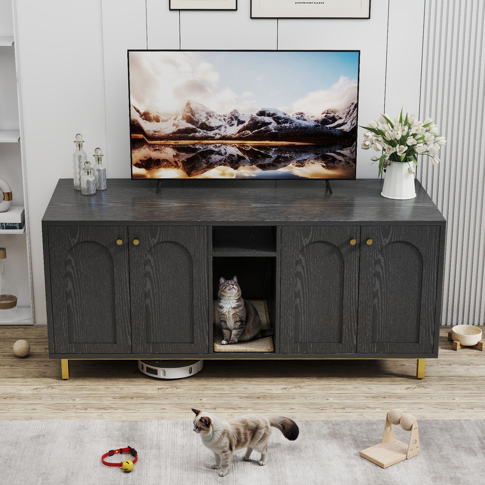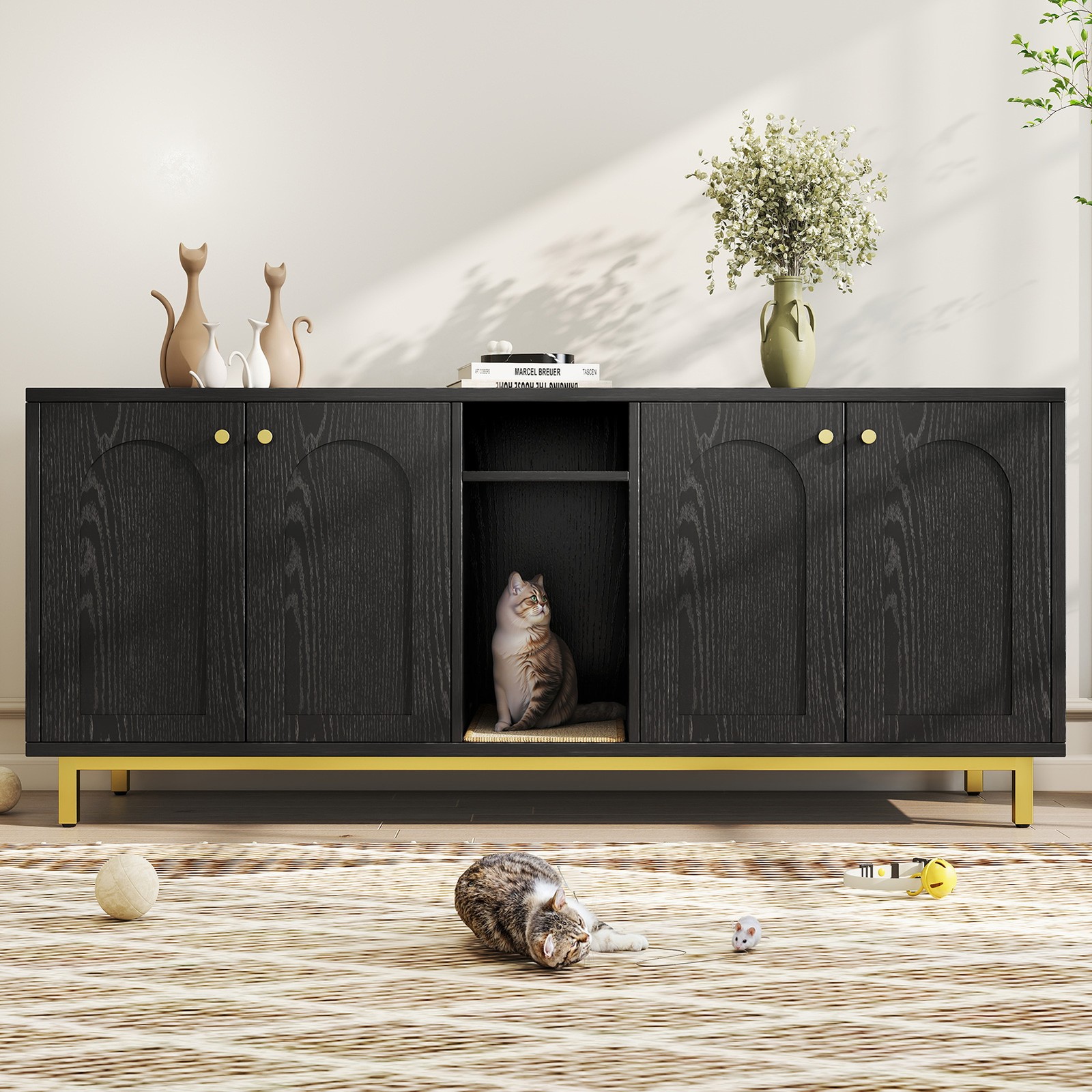 Feature: 1. Spacious Room Design: Our luxurious double cat room design offers ample space for two cats to comfortably use at the same time. This spacious design ensures that both of your furry friends have enough room to feel relaxed and secure. 2. Integrated Scratching Pad: This litter box is equipped with a built in scratching pad, allowing your cats to indulge in their nature scratching instincts as they enter. 3. Multifunctional Furniture: Our large wooden cat litter box serves a dual purpose as a cozy cat house and a stylish piece of furniture. It prevents dogs from accessing the litter area while seamlessly blending in with your home decor, functioning as a TV stand or side table. 4. Magnetic Double Door Design: The innovative magnetic double door design simplifies daily cleaning and litter replacement. The thoughtfully engineered entry mechanism allows your cats to enter with ease, while ensuring proper ventilation and ample light inside. 5. Rugged And Easy To Clean: Made from particle board, this enclosure is built to last and withstand everyday use. The ten small holes at the back effectively eliminate odors, while the easy to clean wooden surface ensures that maintenance is quick and efficient. Specification: Item Type: Cat Litter Box Enclosure Size: Approx. 140 x 60 x 50cm / 55.12 x 23.62 x 19.69in Color: Black Material: Particle Board Doors: 4 Package List: 14 x Boards 2 x Iron Bars 2 x Iron Frames 1 x Scratching Pad 18 x Accessory Packs 1 x Base Fixing Device 1 x Manual