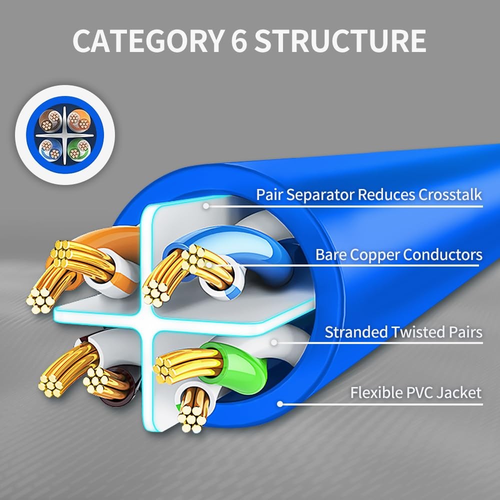This Cat 6 Ethernet cable from is perfect for reliable, high-speed connectivity throughout your home or office network. Constructed with sturdy copper wire and double-shielded foil, it supports bandwidth up to 10Gbps for lightning-fast data transfer between devices. The snagless RJ45 connectors snap securely into place on switches, routers, computers and more. Its moulded PVC jacket resists crushing and abrasions for a long lifespan. Certified by industry standards, you can trust this affordable cable to keep your network running smoothly without interruptions or slowdowns. Cat 6 Performance: TIA/EIA-568C.2 compliant and UL listed, conductors are applied 24 AWG stranded copper wire provides up to Cat6 10-Gigabit Ethernet, backward compatible with 10Base-T, 100base-tx(fast Ethernet) and 1000Base-T (Gigabit Ethernet) for 8P8C cat5e and Cat5 cable. Premium Quality: Gold-plated contact connectors increase transmission stability and durability for daily insertion and removal. UL listed with high quality CM grade PVC material further improves durability of the cable for both in-wall and out-wall use. Compatibility: RJ45 Ethernet patch cable with standard size RJ45 connectors(0.905*0.454*0.315 inch), which can plug in and out more efficient, provides universal connectivity for LAN network components such as PCs, laptop, computer servers, printers, routers, switch boxes, network media players, NAS, VoIP phones, etc. Length: Length does not include connectors and the injuction mold tail, which can help to better estimate and purchase the required length before wiring. Multiple pack and different colors choose can help you to manage your network project easier.