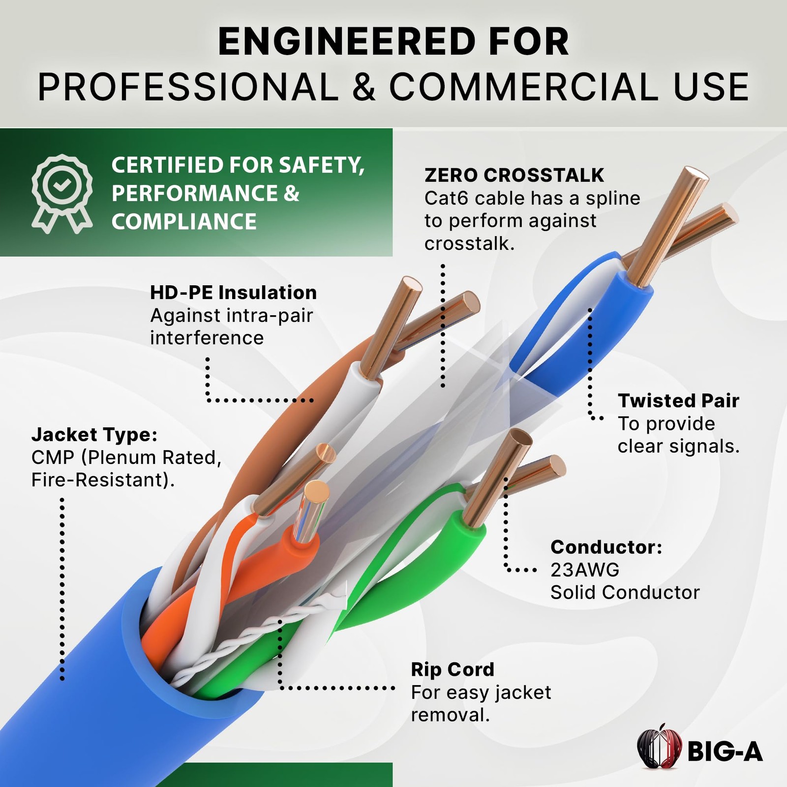 Power up your network with the Plenum Cat 6 Ethernet Cable, a professional-grade solution for high-speed data transmission in commercial and residential setups. With a CMP plenum rating, this 1000ft bulk cable is specifically designed for safe installation in air-handling spaces, such as ceilings and walls, ensuring compliance with industry safety standards. Built for versatile networking needs, this Cat6 cable is compatible with PoE devices, routers, switches, IP cameras, VoIP systems, and more. Whether you're setting up a home network, office, or large-scale commercial infrastructure, this cable provides the durability and flexibility needed for seamless connectivity. Engineered to handle up to 10Gbps speeds and 550MHz bandwidth, this unshielded twisted pair (UTP) cable minimizes interference and enhances signal stability. It features 23 AWG solid copper-clad aluminum (CCA) conductors, delivering reliable performance for modern networking applications. Why Choose Cat 6 Plenum Cable? Superior Data Transfer – Supports up to 10Gbps Ethernet speeds with 550MHz bandwidth, ensuring smooth, high-speed performance. Plenum-Rated for Safety – Meets CMP fire and safety regulations, making it ideal for air ducts, drop ceilings, and enclosed spaces. High-Quality UTP Construction – Designed to reduce signal interference and enhance transmission clarity. Easy Pull Box Design – Comes in a 1000ft tangle-free spool, making installations faster and hassle-free. Versatile Networking Solution – Works with Cat6, Cat5e, and Cat5 devices, supporting security systems, networking infrastructure, and enterprise applications. 1000ft Cat 6 Cable with CMP Rating - This cable features a tough jacket designed for indoor use, made from communications multipurpose plenum materials. The thick, durable jacket ensures safety and longevity, while the solid pure copper conductors maintain excellent signal quality 23 AWG Cat 6 Plenum Cable Unshielded Twisted Pair Construction - Crafted with copper-clad aluminum (CCA), provides reliable performance, supporting data transfer speeds up to 10 Gbps and a 550 MHz bandwidth Each 1000ft UTP Cat6 LAN Cable undergoes testing to guarantee high quality and customer satisfaction. It minimizes crosstalk for better signal integrity and complies with all standards Plenum Ethernet Cord with Convenient Pull-Box Packaging - The cable comes in a sturdy, easy-to-pull box for hassle-free installation. A tangle-free design and length markers along the entire 1000ft make measuring and running the cable straightforward Package Includes: 1000 Feet Cat6 Ethernet Cable is a CMP UTP Bulk Wire, 550 MHz - Blue
