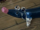 This Catherine Labonte glass sculpture features a contemporary design of a Weiner Dog in transparent blue glass. Measuring 13 inches in length, 6 inches in height, and 3 inches in width, this hand-blown piece showcases a pink swirled nose, adding a whimsical and colorful touch to the figurine. Signed by Catherine Labonte, this original art glass sculpture is a unique and playful addition to any collection, highlighting the artist's expertise in creating novelty pieces with a studio aesthetic. Gorgeous and fun - no chips or cracks - no scratches that I can see or feel - sooo cute for dog or Weiner dog lovers!