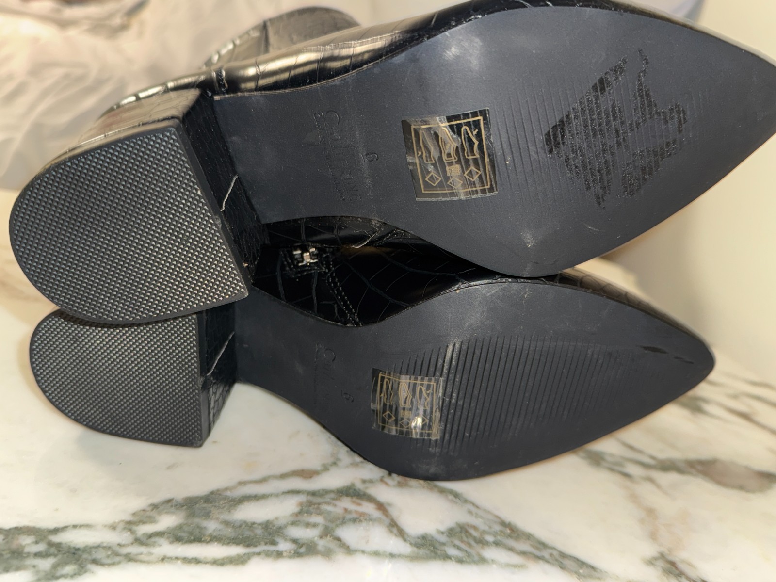 The product is a stylish Catherine Malandrino black crocodile embossed women's heeled boot in size 6. This bootie features a sleek and sophisticated design, perfect for adding a touch of luxury to any outfit. The black color adds a versatile touch while the embossed crocodile detail adds a unique and trendy element to the overall look.