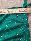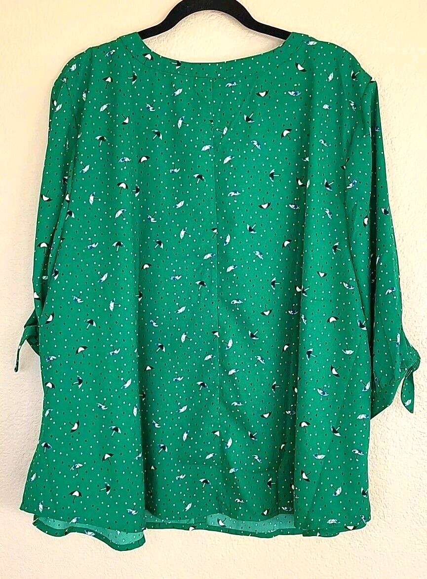 It measures approximately 28" pit to pit, and approximately 25" in length. The sleeves measure approximately 20" from the neckline to the cuff, and the cuff measures approximately 6" in width. The cuffs have adjustable ties. In good condition with no holes or stains. This is a Catherines blouse in size 3XWP is green with an umbrella print. It has a v- crewneck neckline , button closure, and short slit sleeves with a bow accent. The blouse is made of lightweight polyester, suitable for travel, parties, or casual wear in summer, fall, or spring.