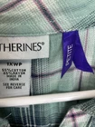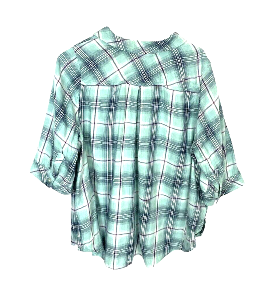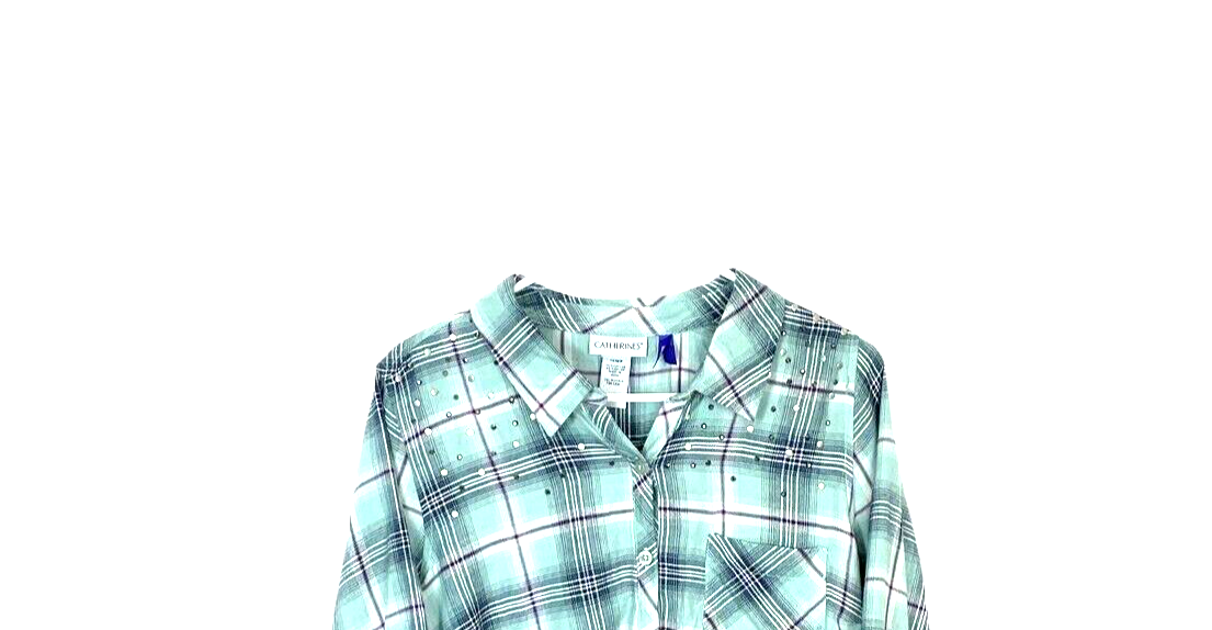 This sale is for a Catherines button up shirt size 1 x P multicolor plaid studded cotton rayon blend. The shirt has a chest pocket. Please examine all pictures before bidding. Please ask all questions before bidding. My items are stored in a smoke free home pet friendly home but please note that they are pre-owned and I cannot guarantee that they will be 100 % scent free . If you have a problem please message me and I will do my best to work it out with you. Please Check out my other items ! Measurements Approximate Unstretched A-A- 24.5 inches Sleeve- 16 inches Length- 27inches