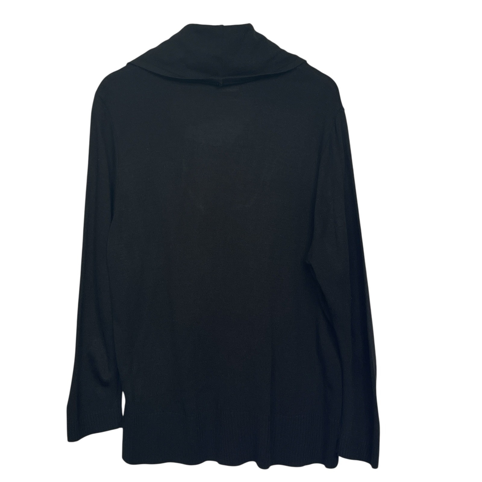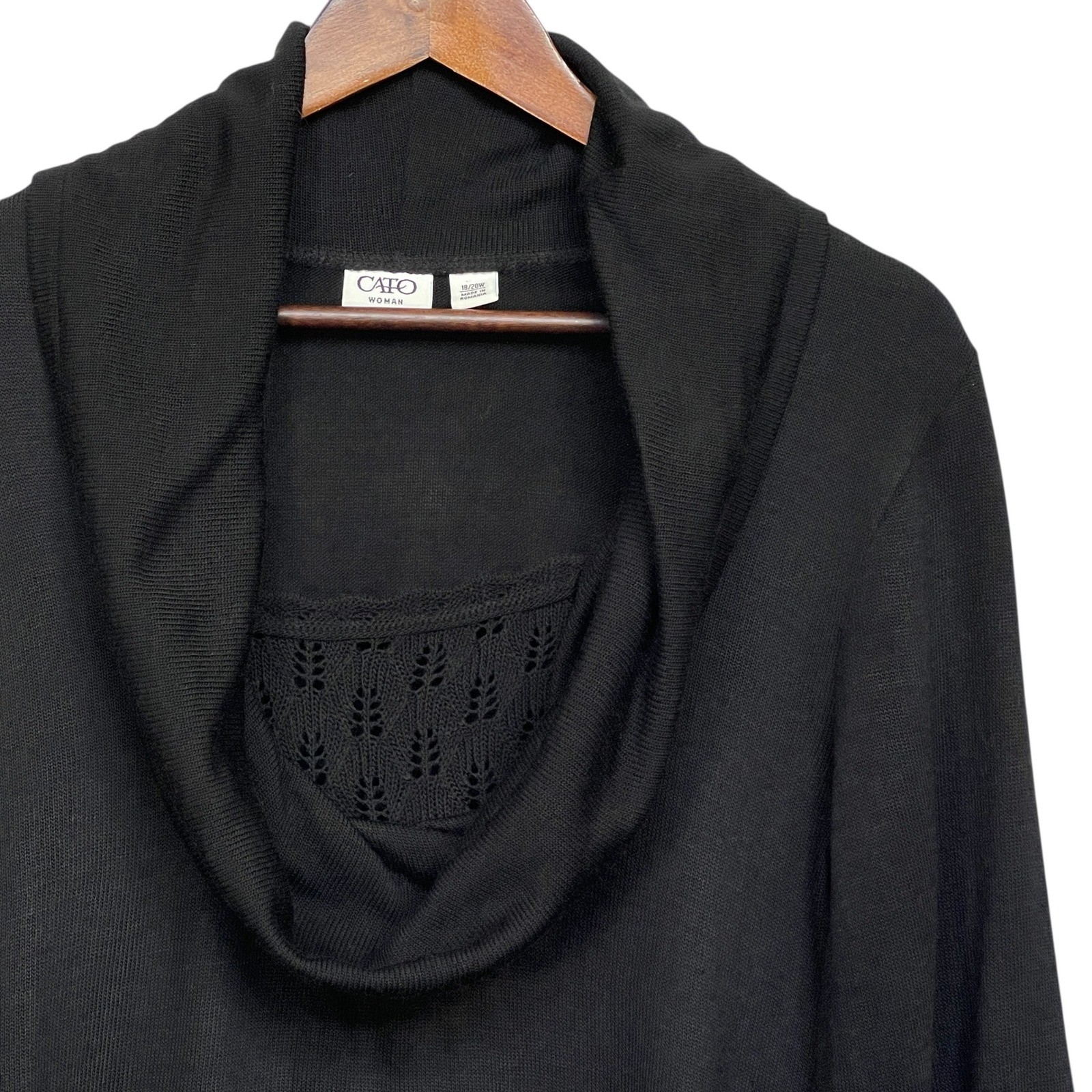 Classic black sweater for a refined yet comfortable look. This features a stylish cowl neckline, long sleeves, and a subtle knit pattern on the upper front. Crafted for a relaxed fit, it's perfect for layering or wearing on its own. Ideal for casual outings, office settings, or cozy evenings at home. Measurements: • Pit to Pit: 22.5 in • Sleeve Length: 25 in • Length: 28 in Style: Pullover Color: Black Department: Women Type: Sweater Material: Acrylic Sleeve Length: Long Sleeve Neckline: Cowl Neck Features: Knit, Relaxed Fit, Comfortable, Layering Pattern: Solid Fabric Type: Knit Accents: Knit Keywords: cato, woman, sweater, pullover, cowl neck, black sweater, long sleeve, knit sweater, plus size, womens sweater, acrylic sweater, size 18/20W, casual sweater, comfortable sweater