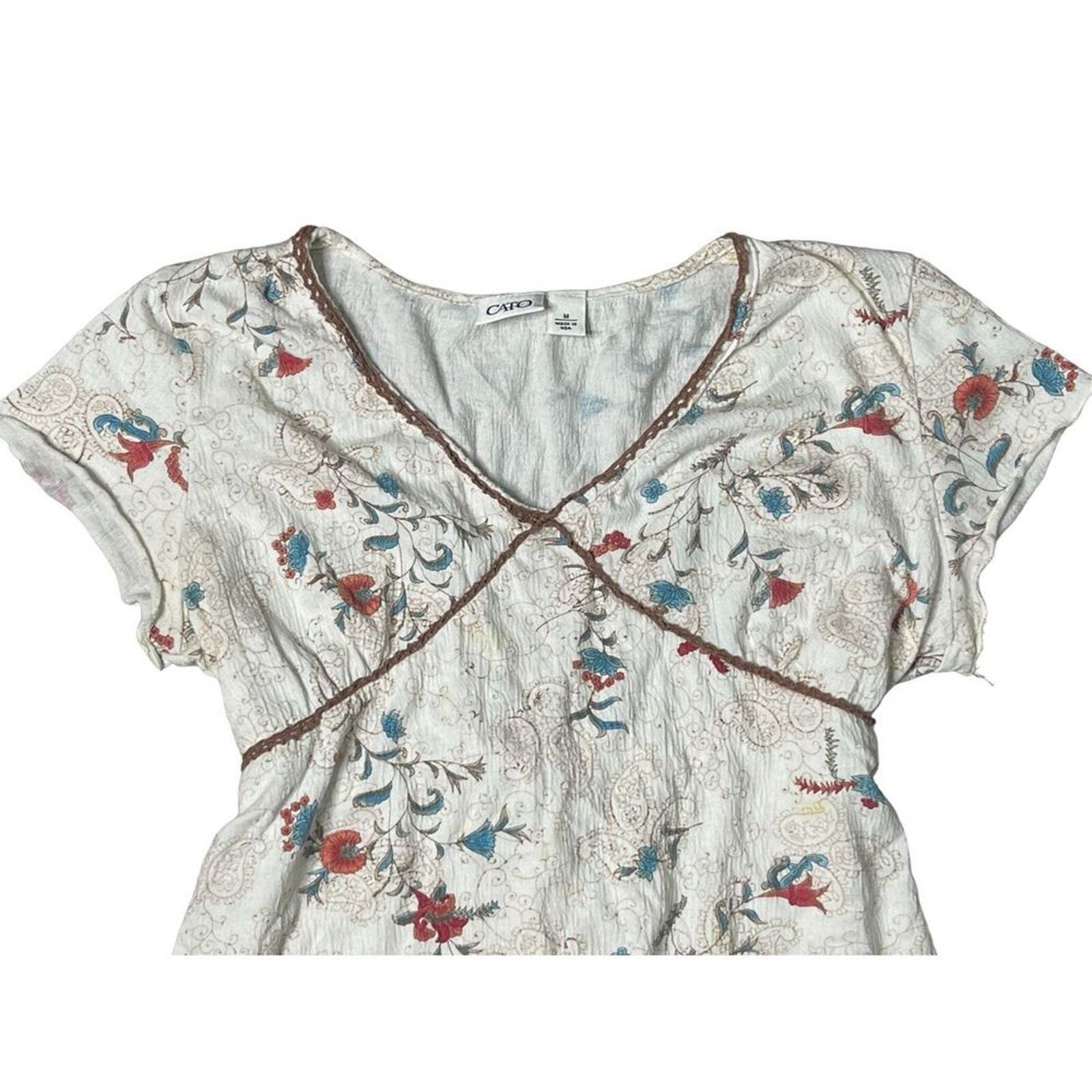 CATO | WOMENS SHORT SLEEVE V-NECK PEASANT BLOUSE FLORAL PRINT M Infuse a touch of rustic charm to your wardrobe with the stunning Cato Peasant Blouse! Cut from airy fabric, this v-neck blouse features short sleeves with a dainty floral print. Perfect for day-to-night wear, the versatile blouse is sure to make heads turn! Whether you style it for an office look or for a sophisticated dinner party, this beauty is sure to deliver on all fronts. Get the perfect balance of simplicity and style with the enchanting Cato Peasant Blouse today. -Cato -Peasant -V-neck -Short sleeve -Floral print -Off white, tan, blue, red -Blouse -Ties in back -Excellent Preowned Condition Size Medium Measurements (approximate) in inches taken flat: Bust 18/waist 16.5/length 22 shoulder to hem Offers welcome! Bundle for best savings! Ships same or next day! 219T