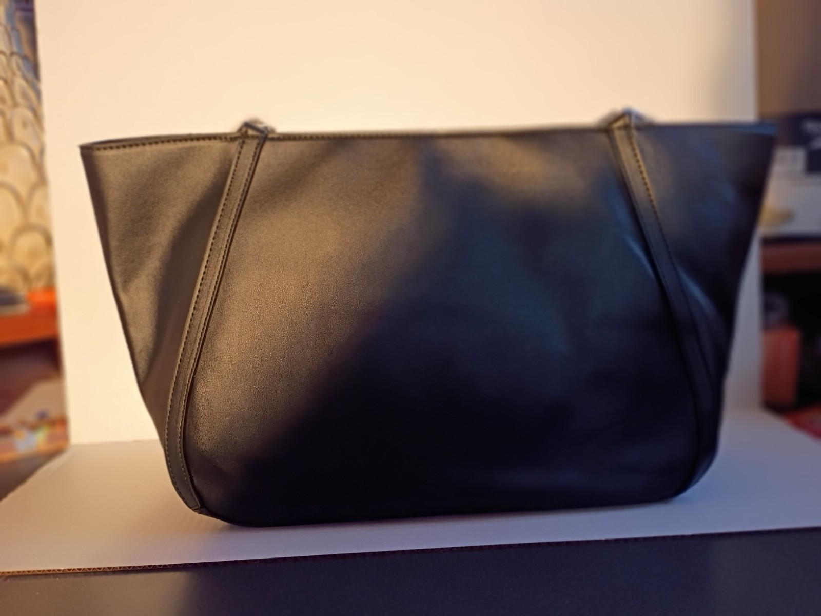The Cavalli Class Sandra Shopper Tote Bag in Black Onyx features a rectangular shape with a zip closure, large size, and gold hardware accents. The faux leather exterior has a logo pattern with double handles in black. It includes inner pockets and a 10-inch strap drop, making it a stylish and practical designer handbag for women. The black onyx exterior color and gold-plated hardware give it a luxurious and sophisticated look, perfect for adding a touch of elegance to any outfit.