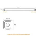 Polished Chrome Ceiling Mounted Shower Head Extension Arm with Flange, 12", Straight, Round, Stainless Steel, IPS 1/2 inch male to NPT 1/2 inch male threads STAINLESS STEEL - Heavy duty stainless construction shower arm with flange, 12 inches length for roof or suspended ceiling mounted U.S. CONNECTIONS - Standard NPT 1/2" tapered thread (male) to ceiling, IPS 1/2" straight thread (male) to shower head FINISH - Polished Chrome finish, mirror like surface, easy to clean and long lasting GUAGE - 15 Guage (1.7mm) thick with 20.5mm outside diameter and 17.1mm inside diameter, seamless body to prevent leakage PACKAGE INCLUDES - 1 x 12" straight ceiling shower arm, 1 x 2.36" by 2.36" flange.