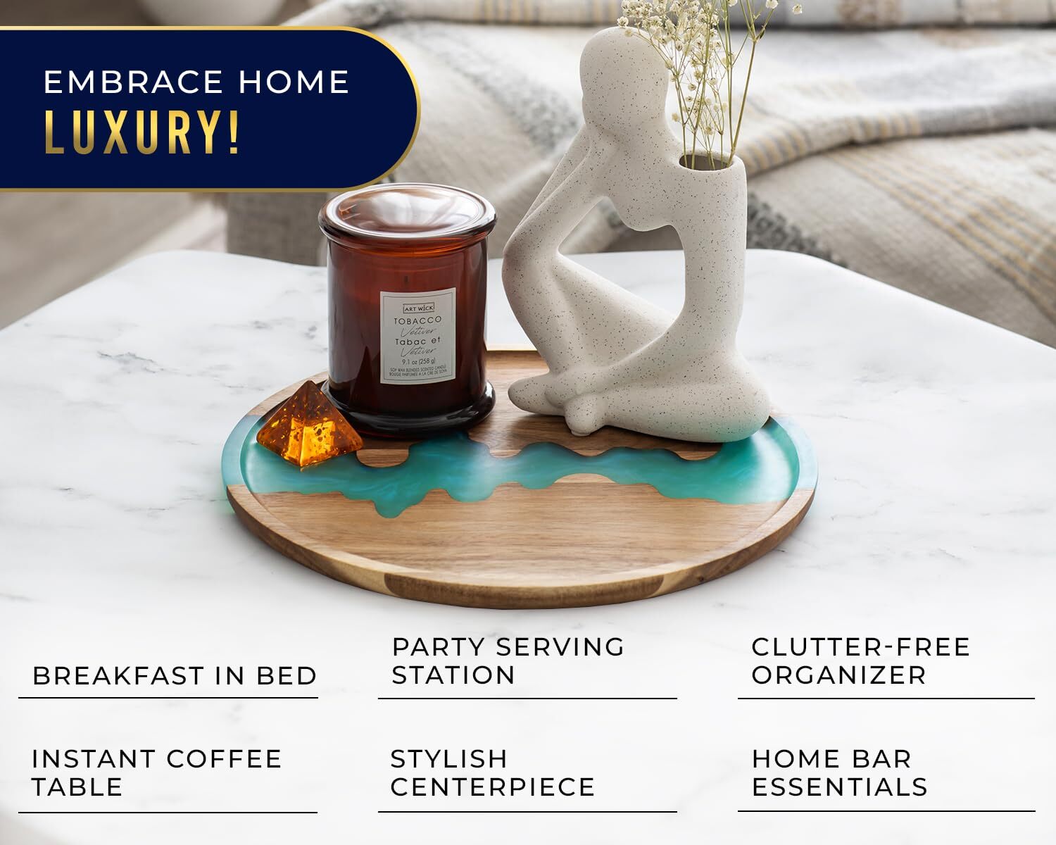 Visually Stunning Celeste Blue Resin + Acacia Wood Serving Tray - Modern Round 12" Serving Tray for Food, Breakfast in Bed, Coffee Table, Decor, Organization, Snacks, Patio, Lap Tray Meticulous Artistry: Each tray, be it by tranquil waters or an enchanted forest, boasts of fine craftsmanship. They harmoniously combine the organic allure of natural wood with the mesmerizing sheen of resin, promising both durability and elegance. Nature Meets Novelty: Imbibing the depth of nature’s hues and accentuated by the gleam of resin, these trays perfectly juxtapose rustic charm with modern design elements. They effortlessly grace both modish lofts and vintage homes. Generous Proportions: These trays are designed keeping aesthetics and utility in mind. Be it for serving delectable appetizers or adorning a coffee table, their dimensions aptly serve myriad purposes. Versatility at Its : just restricted to serving! Envision these trays as captivating centerpieces, platforms for your favorite trinkets, or as elegant bases for cherished keepsakes. Their adaptability ensures they never go unnoticed. Gift of Elegance: Whether it's a housewarming, an anniversary, or just because, presenting one of these trays is tantamount to gifting a blend of nature-beauty and modern artistry. A sure treasure in any abode. Shipping We offer FREE shipping on all orders! We ship within Three business days of payment, usually sooner. We use a selection of shipping services such as UPS, FedEx, USPS etc. We only ship to the lower 48 states, no APO/FPO addresses or PO Boxes allowed. Local pickups and combined shipping options are not provided at this time. Return You can return a product for up to 30 days from the date you purchased it. Any product you return must be in the same condition you received it and in the original packaging. Please keep the receipt. Payment We accept payment by any of the following methods: PayPal Please pay as soon as possible after winning an auction, as that will allow us to post your item to you sooner! Feedback Customer satisfaction is very important to us. If you have any problem with your order, please contact us and we will do our best to make you satisfied. Contact Us If you have any queries, please contact us via ebay. We usually respond within 24 hours on weekdays. Please visit our eBay store to check out other items for sale! Thank you for shopping at our store.