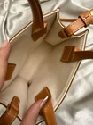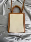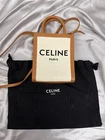 CELINE Canvas Calfskin Mini Vertical Cabas in Natural and Tan. This sleek tote is beautifully crafted of natural canvas with tan leather trim. The bag features tan leather top handles, an optional shoulder strap, and a black Celine logo at the center. The top is open to a spacious canvas interior. In very good pre-loved condition. Very minor darkening on he corners. Comes with the original dust bag and the Certificate Of Authenticity by Real Authentication! Hight:8'' Depth: 2'' Width:7''