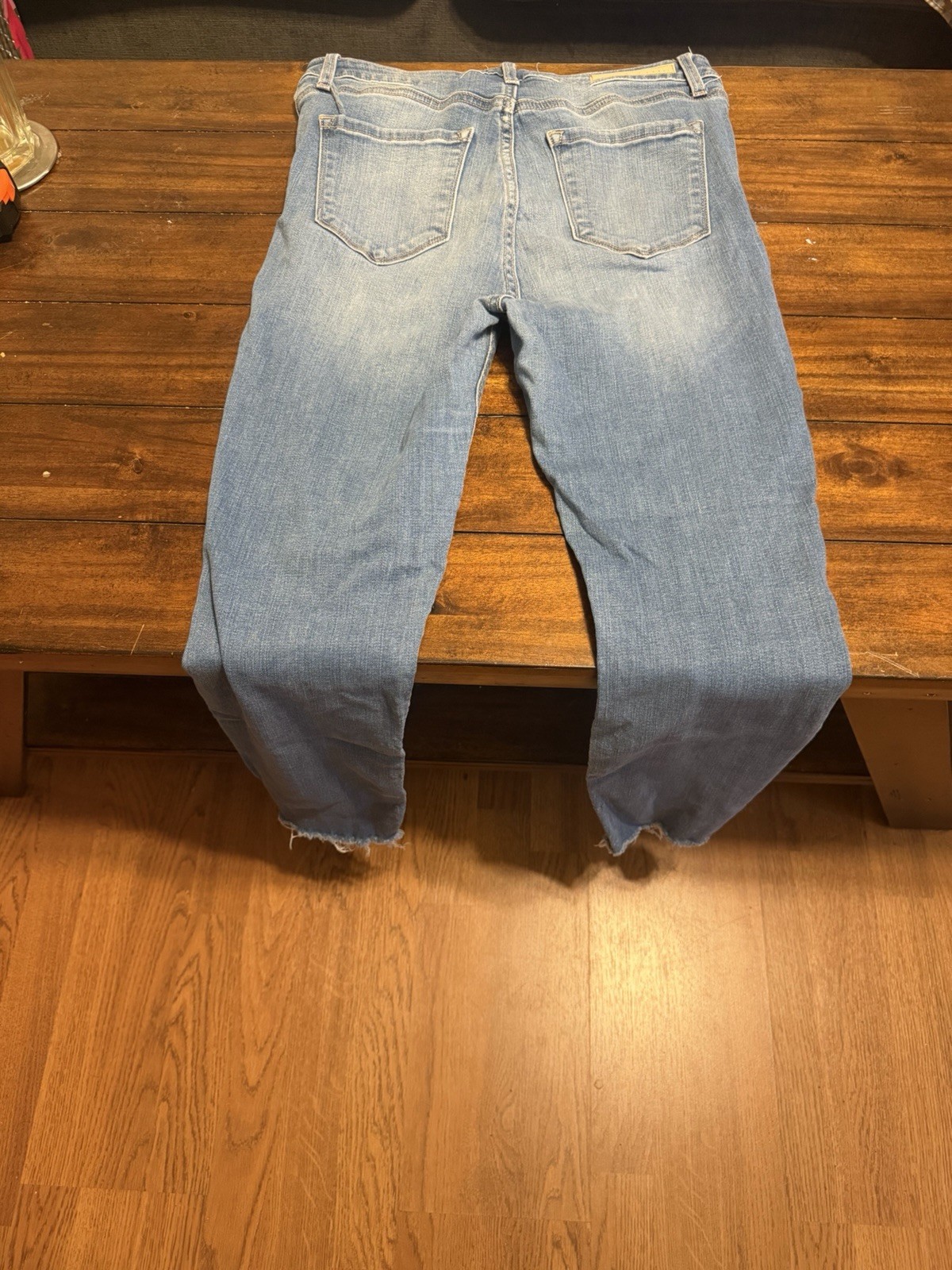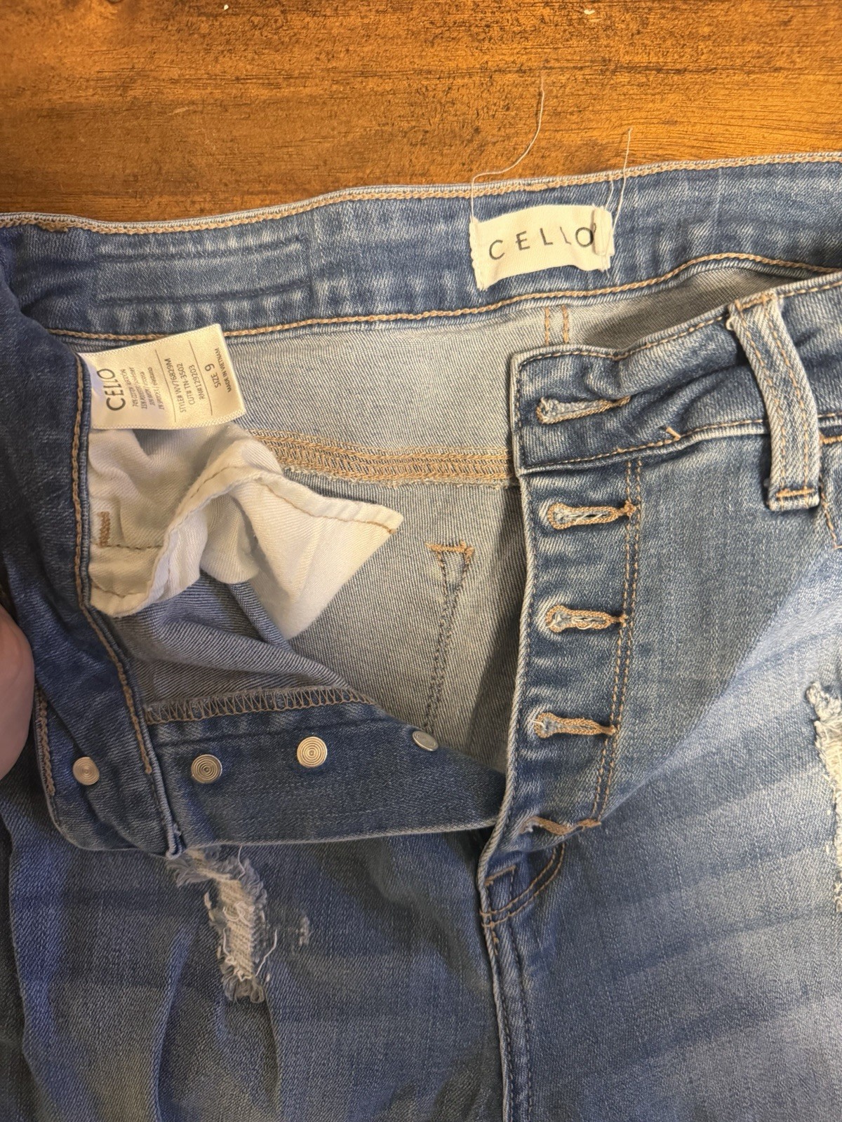 The product is a pair of pre-owned Cello Size 9 women's jeans in excellent condition. These solid blue jeans feature a zip closure, medium fabric wash, denim fabric, and a regular fit. They have a 5-pocket design with a straight style, making them suitable for the summer, fall, and spring seasons. These jeans are machine washable and do not have a vintage look or handmade design.