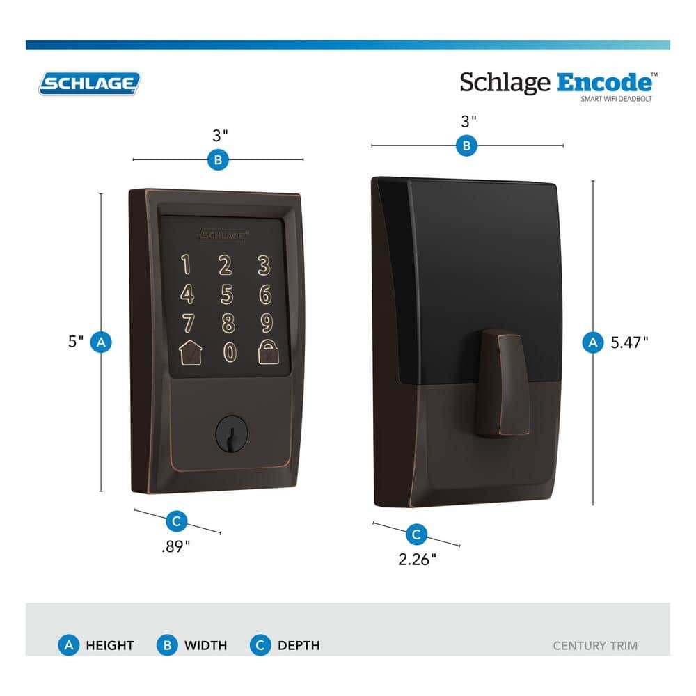 Century Aged Bronze Electronic Encode Smart WiFi Deadbolt with Alarm Electronic Deadbolts Manage with Schlage Home app; Works with Alexa and Google Home Built-in WiFi for remote access; no smart home hub required AAA highest BHMA rating and 3 year electronic warranty The Schlage Encode Smart WiFi Deadbolt offers peace of mind from anywhere by allowing you to remotely manage your lock via the Schlage Home app. Seamlessly control and monitor your home from anywhere when connected to your home??s WiFi network and paired with the Schlage Home app, no additional accessories needed. Conveniently schedule up to 100 access codes for keyless entry, view lock history, receive push notifications, pair with Amazon Alexa and Google Assistant for hands-free control,... Urintelligentbi Hello, respected customer Century Aged Bronze Electronic Encode Smart WiFi Deadbolt with Alarm Century Aged Bronze Electronic Encode Smart WiFi Deadbolt with Alarm Electronic Deadbolts Manage with Schlage Home app; Works with Alexa and Google Home Built-in WiFi for remote access; no smart home hub required AAA highest BHMA rating and 3 year electronic warranty The Schlage Encode Smart WiFi Deadbolt offers peace of mind from anywhere by allowing you to remotely manage your lock via the Schlage Home app. Seamlessly control and monitor your home from anywhere when connected to your home??s WiFi network and paired with the Schlage Home app, no additional accessories needed. Conveniently schedule up to 100 access codes for keyless entry, view lock history, receive push notifications, pair with Amazon Alexa and Google Assistant for hands-free control, and so much more. This innovative smart lock is available in a variety of styles and finishes that pair perfectly with Schlage interior door hardware, creating a cohesive look throughout the home. The Schlage Encode Smart WiFi Deadbolt offers the advanced features of secure encryption and built-in alarm technology. It is certified highest in Security, Durability, and Finish by BHMA industry experts and backed by a century of trusted innovation and security from Schlage. ANYWHERE ACCESS: With built-in WiFi compatibility, you can easily and securely connect your Schlage Encode Deadbolt to your home WiFi network to control and monitor your home from anywhere with the Schlage Home app PEACE OF MIND: Lock and unlock from anywhere, manage up to 100 access codes for keyless entry, view lock history, receive customizable notifications and easily manage multiple locks at once - all when paired to the Schlage Home app and connected to a secure WiFi network VOICE CONTROL: Works with Amazon Alexa and Google Assistant for optional, hands-free convenience when paired with the Schlage Home app and a voice enabled device ADVANCED SECURITY: Secure, encrypted connection; built-in, customizable alarm for door movement and forced entry attempts; fingerprint-resistant touchscreen; certified highest residential Security, Durability and Finish rating by BHMA industry experts EASY INSTALL: Install in minutes with just a screwdriver, no hardwiring required; Snap 'n Stay design helps keep the lock on the door so both hands are free; fits standard doors with 1-3/8 in to 1-3/4 in door thickness and 2-3/8 in or 2-3/4 in backset COME AND GO WITH EASE: Auto-lock conveniently relocks the door for you and has a variety of time delay options to choose from or can be turned off completely; One-touch locking from the exterior touchscreen makes locking up when leaving easy BATTERY-OPERATED: Uses four AA batteries-included; up to six months of battery life with typical use; low-battery indicator on lock touchscreen and in Schlage Home app provides advance notice; one physical backup key included WARRANTY: Limited lifetime mechanical and finish warranty and 3-year electronics warranty, see Schlage for full details Click here to shop all Schlage products Click here for more Schlage Door Hardware products Click here for more information on Electronic Recycling Programs Item Specifics Brand Schlage Type Animal Barriers length width height weight 3 lb Payment [ 1. We accept Paypal. Each buyer's payments is protected by Ebay. 2. Payment time affects delivery time. 3. If you want more quantities or other models , please contact us! ] Shipping [ 1.Processing time It normally takes 3 business days. We will confirm in time after receiving the payment from the buyer, verify the address of buyer then deliver the item according to the buyer's order time. 2.Shipping time We ship to eBay's address only,please ensure your address in eBay. We ship to all parts of the world, but we are sorry that we do not support the Russian Federation and Ukraine for the time being. There may be some delay due to flight, National holiday, weather, local natural disaster impact, etc, hope you can be patient and contact us freely, we will try our best to help you. ] Returns [ 1. We gu arantee to provide you with a five-star shopping experience, and provide return& refund services for buyers. If you are not satisfied when you receive the items, please contact us within 30 days for return and refund. (Buyer pays return shipping) 2. Please don't open case via ebay or paypal. 3. For order questions please contact us via the Ebay Message System. We are willing to answer your questions and we will provide you the best soloution within 24 hours. Please understand that we are not in the office on Saturday and Sunday, so the questions asked over the weekend will be answered on the following Monday. 4. We sincerely invite you to leave a fair feedback after completing the transaction. If you are satisfied with our service, please rate us. Your valuable feedback and comments are very important to us. ] Contact Us If you are not satisfied when you receive the items, please contact us within 30 days for return and refund. (Buyer pays return shipping) Urintelligentbi Hello, respected customer DESCRIPTION PAYMENT SHIPPING RETURN POLICY CONTACT US Shop Category Store 