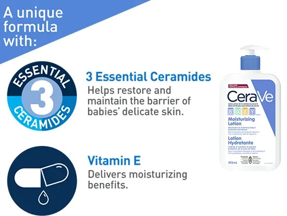 CeraVe Baby Moisturizing Lotion is designed to provide gentle and effective care for your baby's delicate skin. Developed with pediatric dermatologists, this lightweight, non-greasy lotion contains essential ceramides, niacinamide, hyaluronic acid, and vitamin E to maintain and restore the skin's natural barrier. Fragrance-free and paraben-free, it offers soothing and long-lasting hydration. Ideal for daily use, it keeps your baby's skin soft, smooth, and healthy. Benefits: 24-Hour Hydration: Provides long-lasting moisture to keep your baby's skin soft and smooth throughout the day. Supports Skin Barrier: Contains essential ceramides that help maintain and restore the skin's natural barrier. Soothing and Calming: Niacinamide helps to calm and soothe the skin, reducing any irritation or discomfort. Gentle and Safe: Fragrance-free, paraben-free, and formulated with safe ingredients for delicate baby skin. Trusted by Experts: Developed with pediatric dermatologists to ensure it meets the highest standards of care. How to use: Apply to Clean Skin: Use after your baby's bath or whenever their skin needs moisture. Dispense Lotion: Squeeze a small amount of lotion onto your hands. Gently Massage: Rub your hands together to warm up the lotion, then gently massage it into your baby's skin using circular motions. Focus on Dry Areas: Pay extra attention to dry areas, making sure the lotion is fully absorbed. Ingredients: Purified Water, Glycerin, Cetearyl Alcohol, Caprylic/Capric Triglyceride, Petrolatum, Ceteareth-20, Ceramides (1, 3, 6-II), Hyaluronic Acid, Cholesterol, Phytosphingosine, Xanthan Gum, Dimethicone, Tocopherol.