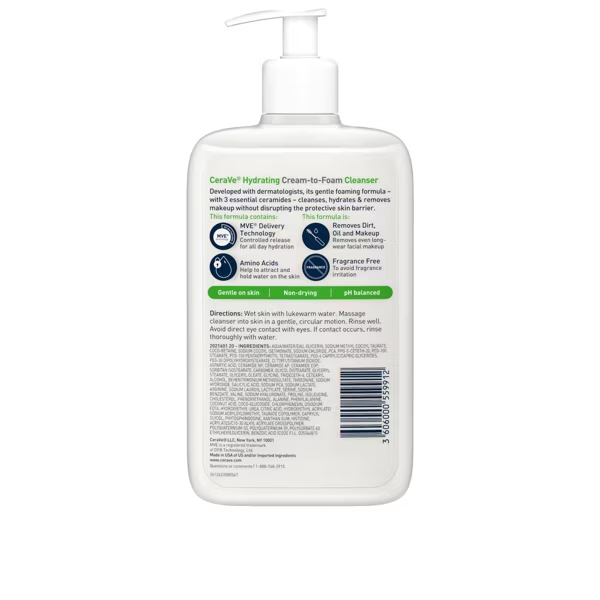 CeraVe Hydrating Cream-to-Foam Face Wash with Hyaluronic Acid for Normal to Dry Skin Description Developed with dermatologists, CeraVe Hydrating Cream-to-Foam Face Cleanser is a one-step face wash for daily facial cleansing, face and eye makeup removal, and long-lasting hydration. Gently removes dirt, excess oil, and even long-wear foundation and daily SPF sunscreen residue. Cleanser for face dispenses as a rich cream and transforms into a foam as you lather into skin. Non-drying formula thoroughly cleanses without stripping skin of moisture or leaving a tight, dry feeling. Suitable for normal to dry skin. Fragrance free, paraben-free, soap-free, non-comedogenic, and pH balanced. Can be used as a face wash, body wash and/or hand soap. Unisex. Suitable for all skin types, contact lens wearers, adults and young adults (12+). Consumer Results: • 100% of users* agree that it instantly removes dirt, oil, pollution and facial makeup • 98% of users* agree that this cleanser efficiently yet gently and effortlessly cleanses their skin • 98% of users* agree that this cleanser is pleasant to use, with a delicate, gentle foam • More than 98%* of users find their skin clean, smooth, soft, refreshed, and healthy without feeling stripped • More than 98%*of users love this cleanser after 2 weeks of daily use Our new CeraVe bottles, contain the same Developed with Dermatologists formulas you know and love and the same amount. The bottles are now made with LESS plastic and 100% Recycled plastic (excluding the pump). The 8oz and 12oz bottle sizes contain 17% and 21% less plastic compared to the current bottles, respectively. Key Ingredients: • Amino acids help attract and hold water on the skin • Ceramides help restore and maintain the skin's natural barrier • Hyaluronic acid attracts hydration to the skin's surface and helps dry skin retain moisture • MVE Technology encapsulates ceramides to ensure efficient delivery within the skin’s barrier and slow release over time, supporting your protective skin barrier long after you’ve finish applying. How to use: Wet face with lukewarm water. Rub cleanser in your hands until you get a dense foam, then massage into face and eye area in a gentle, circular motions. Rinse well. Avoid direct contact with eyes. If contact occurs, rinse thoroughly with water. Highlights ALL-IN-ONE DAILY FACIAL CLEANSER: One-step skin care, foaming face wash for face & eye makeup removal while providing long-lasting hydration. Foaming cleanser gently removes dirt, excess oil, and even long-wear makeup and sunscreen residue. CREAM TO FOAM HYDRATING CLEANSER: Moisturizing face wash dispenses as a rich cream and transforms into a foam as you lather into skin. Non-drying formula, thoroughly cleanses without stripping skin of moisture or leaving a tight, dry feeling. DRY SKIN FACE WASH: Gentle face wash formulated with hyaluronic acid and amino acids to support skin's Natural Moisturizing Factors (NMF) to retain moisture. Hydrating face wash suitable for normal to dry skin. 100% RECYCLED PLASTIC: Packaging contains recycled content - CeraVe's Hydrating Cream-to-Foam Cleanser 8oz and 12oz bottles are made from 100% post-consumer recycled content (PCR) excluding the pump. REFILLABLE: Bottles can be refilled with CeraVe's NEW Hydrating Cream-to-Foam Cleanser refill pouch (16oz) 3 ESSENTIAL CERAMIDES: Ceramides are found naturally in the skin and make up 50% of the lipids in the skin barrier. All CeraVe products, formulated with three essential ceramides (1, 3, 6-II) to help maintain the skin’s natural barrier. DEVELOPED WITH DERMATOLOGISTS: CeraVe Skincare is developed with dermatologists and has products suitable for dry skin, sensitive skin, oily skin, acne-prone, and more. COMPLETE YOUR SHOWER ROUTINE: Explore CeraVe's NEW scalp & hair care range suitable for all hair types, all curl patterns, color-treated hair, and sensitive scalps.