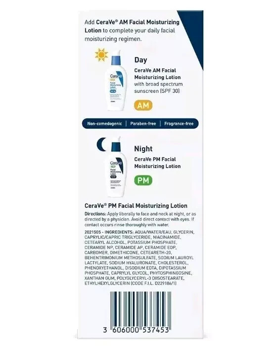 CeraVe Facial Moisturizing Lotion PM Ultra Lightweight 3 oz Original. OIL FREE NIGHT LOTION ] Use Cerave PM facial lotion as the last step in an evening skincare routine. If layering with an eye cream, moisturizer or facial serum, apply the Cerave night lotion after other product applications have been fully absorbed OVERNIGHT MOISTURIZER ] Cerave’s PM face cream contains niacinamide to help calm the skin and uses MVE Technology to deliver hydration throughout the night. It also contains hyaluronic acid to help retain skin's moisture GENTLE ON SKIN ] Fragrance free, paraben-free, oil free, non-comedogenic, and allergy-tested 3 ESSENTIAL CERAMIDES ] Ceramides are found naturally in the skin and make up 50% of the lipids in the skin barrier. All CeraVe products are formulated with three essential ceramides (1, 3, 6-II) to help restore and maintain the skin’s natural barrier DEVELOPED WITH DERMATOLOGISTS ] CeraVe Skincare is developed with dermatologists and has products suitable for dry skin, sensitive skin, oily skin, acne-prone, and more. PM FACIAL MOISTURIZER] With Niacinamide moisturizes throughout the night & helps restore the protective skin barrier HYALURONIC ACID] Helps retain skin's moisture PATENTED TECHNOLOGY] Utilizes patented MVE controlled-release technology to help deliver long-lasting moisturization