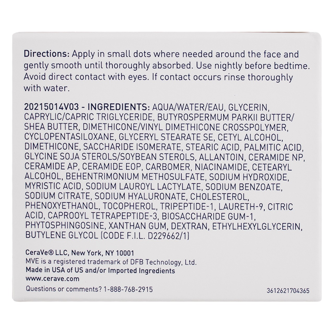 Product Description CeraVe Skin Renewing Night Cream features a complex of biomimetic peptides, hyaluronic acid and three essential ceramides to refresh and hydrate tired-looking skin while helping to restore the skin's natural barrier overnight. This non-greasy, intensely moisturizing skin renewing night cream is designed to soften and renew the look of tired skin, and patented MVE Delivery Technology continually releases moisturizing ingredients all night -so you can wake up looking rested and rejuvenated. Skin-softening night cream helps reduce the look of fine lines and wrinkles while supporting skin elasticity Improves the appearance of tired skin overnight with biomimetic peptides Non-irritating, non-greasy, and intensely hydrating formula Helps restore the protective skin barrier with ceramides Helps attract moisture to the skin with hyaluronic acid Helps soothe the skin with niacinamide Non-comedogenic and fragrance-free Developed with dermatologists Key Ingredients: Encapsulated retinol in a timed-release formula provides mild exfoliation and improves visible signs of aging without irritation Biomimetic peptides improve the appearance of tired-looking skin Ceramides help restore and maintain the skin's natural barrier Hyaluronic acid attracts hydration to the skin's surface and helps skin retain moisture Niacinamide helps calm the skin MVE Technology, a patented delivery system, continually releases moisturizing ingredients Brand Story: CeraVe is the #1 dermatologist recommended skincare brand*. Whether you need products for your sensitive, oily, acne-prone, combination or normal skin, need a soothing moisturizer for your baby, have specific skin concerns, like eczema or psoriasis, or just want a hydrating serum or anti-aging cream, CeraVe can help. The CeraVe story began in 2005 after experts noticed that many skin conditions such as acne, eczema, psoriasis and dry skin all had one thing in common: a compromised skin barrier. Developed with dermatologists, CeraVe offers a complete line of skincare products that contain three essential ceramides enhanced with a revolutionary delivery system to help restore the skin's natural protective barrier. *IQVIA, ProSource Survey, Q1-Q4 2020 Made in United States(of US and/or imported ingredients) Ingredients AQUA / WATER / EAU, GLYCERIN, CAPRYLIC/CAPRIC TRIGLYCERIDE, BUTYROSPERMUM PARKII BUTTER / SHEA BUTTER, DIMETHICONE/VINYL DIMETHICONE CROSSPOLYMER, CYCLOPENTASILOXANE, GLYCERYL STEARATE SE, CETYL ALCOHOL, DIMETHICONE, SACCHARIDE ISOMERATE, STEARIC ACID, PALMITIC ACID, GLYCINE SOJA STEROLS / SOYBEAN STEROLS, ALLANTOIN, CERAMIDE NP, CERAMIDE AP, CERAMIDE EOP, CARBOMER, NIACINAMIDE, CETEARYL ALCOHOL, BEHENTRIMONIUM METHOSULFATE, SODIUM HYDROXIDE, MYRISTIC ACID, SODIUM LAUROYL LACTYLATE, SODIUM BENZOATE, SODIUM CITRATE, SODIUM HYALURONATE, CHOLESTEROL, PHENOXYETHANOL, TOCOPHEROL, TRIPEPTIDE-1, LAURETH-9, CITRIC ACID, CAPROYL TETRAPEPTIDE-3, BIOSACCHARIDE GUM-1, PHYTOSPHINGOSINE, XANTHAN GUM, DEXTRAN, ETHYLHEXYLGLYCERIN, BUTYLENE GLYCOL Instructions Apply in small dots where needed around the face Gently smooth until thoroughly absorbed Use nightly before bedtime Product Description CeraVe Skin Renewing Night Cream features a complex of biomimetic peptides, hyaluronic acid and three essential ceramides to refresh and hydrate tired-looking skin while helping to restore the skin's natural barrier overnight. This non-greasy, intensely moisturizing skin renewing night cream is designed to soften and renew the look of tired skin, and patented MVE Delivery Technology continually releases moisturizing ingredients all night -so you can wake up looking rested and rejuvenated. Skin-softening night cream helps reduce the look of fine lines and wrinkles while supporting skin elasticity Improves the appearance of tired skin overnight with biomimetic peptides Non-irritating, non-greasy, and intensely hydrating formula Helps restore the protective skin barrier with ceramides Helps attract moisture to the skin with hyaluronic acid Helps soothe the skin with niacinamide Non-comedogenic and fragrance-free Developed with dermatologists Key Ingredients: Encapsulated retinol in a timed-release formula provides mild exfoliation and improves visible signs of aging without irritation Biomimetic peptides improve the appearance of tired-looking skin Ceramides help restore and maintain the skin's natural barrier Hyaluronic acid attracts hydration to the skin's surface and helps skin retain moisture Niacinamide helps calm the skin MVE Technology, a patented delivery system, continually releases moisturizing ingredients Brand Story: CeraVe is the #1 dermatologist recommended skincare brand*. Whether you need products for your sensitive, oily, acne-prone, combination or normal skin, need a soothing moisturizer for your baby, have specific skin concerns, like eczema or psoriasis, or just want a hydrating serum or anti-aging cream, CeraVe can help. The CeraVe story began in 2005 after experts noticed that many skin conditions such as acne, eczema, psoriasis and dry skin all had one thing in common: a compromised skin barrier. Developed with dermatologists, CeraVe offers a complete line of skincare products that contain three essential ceramides enhanced with a revolutionary delivery system to help restore the skin's natural protective barrier. *IQVIA, ProSource Survey, Q1-Q4 2020 Made in United States(of US and/or imported ingredients) Ingredients AQUA / WATER / EAU, GLYCERIN, CAPRYLIC/CAPRIC TRIGLYCERIDE, BUTYROSPERMUM PARKII BUTTER / SHEA BUTTER, DIMETHICONE/VINYL DIMETHICONE CROSSPOLYMER, CYCLOPENTASILOXANE, GLYCERYL STEARATE SE, CETYL ALCOHOL, DIMETHICONE, SACCHARIDE ISOMERATE, STEARIC ACID, PALMITIC ACID, GLYCINE SOJA STEROLS / SOYBEAN STEROLS, ALLANTOIN, CERAMIDE NP, CERAMIDE AP, CERAMIDE EOP, CARBOMER, NIACINAMIDE, CETEARYL ALCOHOL, BEHENTRIMONIUM METHOSULFATE, SODIUM HYDROXIDE, MYRISTIC ACID, SODIUM LAUROYL LACTYLATE, SODIUM BENZOATE, SODIUM CITRATE, SODIUM HYALUR