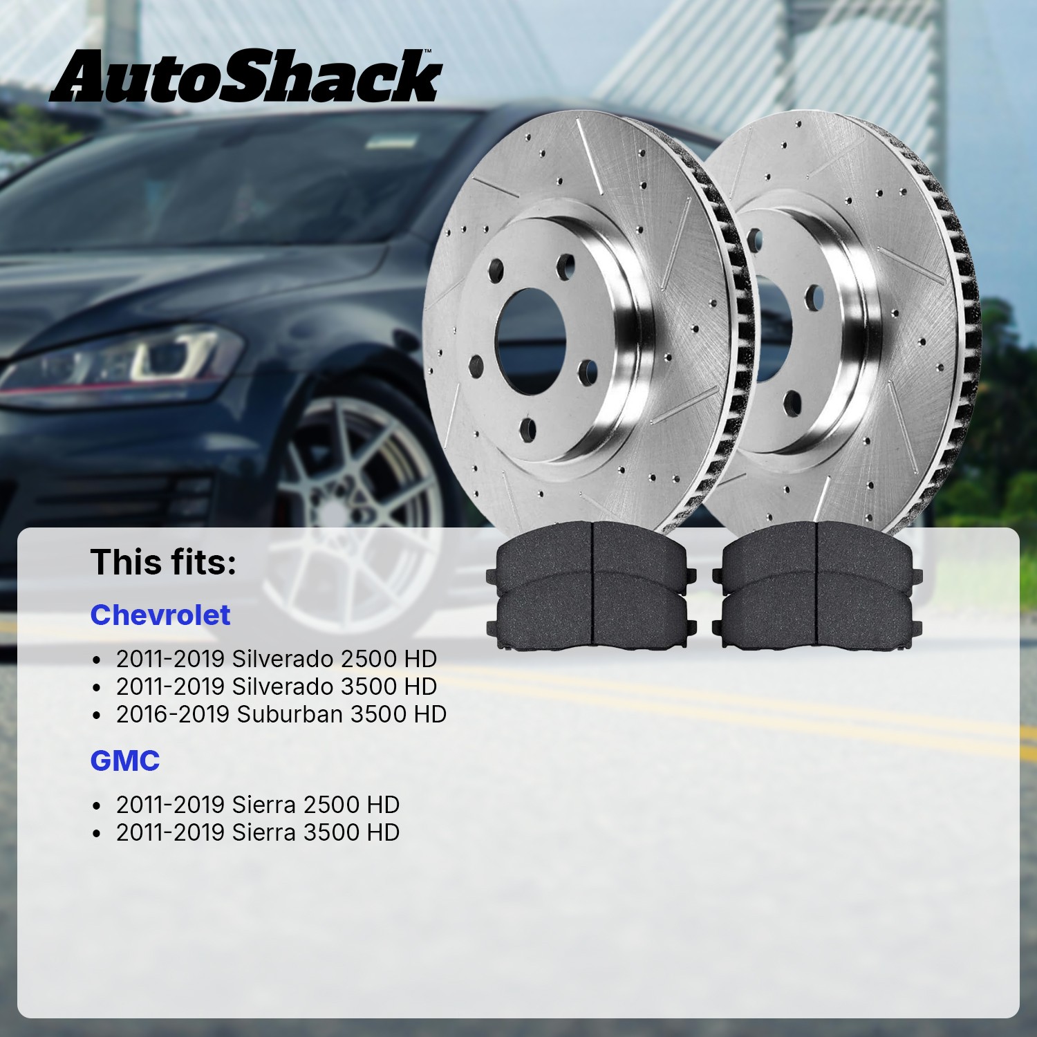 Front Drilled Disc Rotors Ceramic Brake Pads for Chevy Silverado 2500 HD Customer Service Returns Shipping Information Warranty At AutoShack, we offer exceptional and fast service to ensure you get the right parts as quick as possible. If you have any questions regarding out parts and services, please ask us a question. Business Hours Monday to Friday: 8:00 am - 7:00 pm ET Saturday: 9:00 am - 6:00 pm ET Sunday: Closed You may also send us an email through eBay at the top right corner of this page. "We are committed to provide you, our valued customer, with a 100% customer experience. We welcome you to contact our experienced customer service representatives with any questions you may have." Our Knowledgeable Customer Service Representatives Are Ready To Help. We will gladly accept the return of your purchased item(s) for a full refund as long as the return is made within 30 days of the invoice date and the item(s) have not been damaged or installed. Purchased bundles may only be returned as a complete bundle. Partial returns of bundles is not permitted. Please Note - AutoShack does not provide free return shipping. Return Shipping cost is only covered in the event of an AutoShack error. FREE SHIPPING* ON ALL PURCHASES! Shipping Options Most orders placed with AutoShack qualify for free shipping within the Continental US. Some order will have an additional shipping cost due to package size or being outside of standard delivery area. *Warranty Replacement items covered under AutoShack’s 6 month Warranty and Limited Lifetime warranty do not include shipping costs due to package size or being outside of standard delivery area. Standard Delivery (Included Free) Delivery is between 2-7 business days. The suggested delivery arrival dates on the site are an estimated arrival time and not guaranteed. All shipping carriers reserve the right to extend delivery time by 24 hours to residential deliveries. This is beyond our control and shipping charges will not be refunded for this reason. Upon receiving your order, inspect all packages thoroughly for missing, damaged, or incorrect parts. Our auto parts warehouse puts forth every effort to prevent shipping damage, however, it does occur occasionally. If you receive your product and it is damaged, please contact our customer support as soon as possible as AutoShack will only accept your claim for up to 4 days from the date of delivery. Please document any damage, as we will require photos. Damaged products will not be accepted for refund unless AutoShack customer service has been contacted and the proper documentation has been provided. You can contact us by telephone, by our option to send an email or by chat. Two Day Express Shipping 2 Business Day Express shipping is now available. Orders placed before 12 pm EST will ship on the same business day. Warranty replacements Items do not ship with Express Shipping. If the customer would like to Have the Limited Lifetime Warranty Replacement Shipped Express, they can pay a nominal fee to get Express Shipping. Due to Express Shipping involving Air Travel some items cannot be shipped express at this time. Currently, these items are AutoShack Strut and Shocks. Note: Because we are a retailer and not a wholesaler, there is a maximum purchase limit of $775 per shipping address per 24-hours. Canadian customers can find our listings on eBay.CA Standard AutoShack Warranty IMPORTANT: By using your AutoShack product, you are agreeing to be bound by the terms of the AutoShack Warranty as set out below. Do not use your product until you have read the terms of the warranty agreement. If you do not agree to the terms of the warranty agreement, do not use the product and return it within the return period stated by eBay. AutoShack hereby warrants, to the original purchaser, that all auto parts & accessories contained in the original packaging against any defects in material and workmanship. All parts sold by AutoShack are brand new, serviceable, and functional. If an auto part is found to be defective within six months* from the original date of purchase AutoShack shall, at its discretion, provide a one-time replacement part. AutoShack is not responsible for, and the warranty does not cover, any damages arising from a failure to operate the product within its intended uses. This warranty does not cover products purchased from sources other than AutoShack. No reimbursements will be given for the delay, labor, mileage, or any other costs involved in the installation or re-installation of the auto parts in question. Warranty does not cover parts installed for an incorrect application. Warranty and shipping damage-related claims may require authentication including, but not limited to Mechanic Diagnosis, Pictures or Video of damaged goods – do not dispose of parts until instructed. Failure to provide authenticating documentation could result in denial of the current warranty claim and forfeit of future warranty. Please note that Struts and Complete Struts must be purchased in pairs (front or rear) or warranty is NULL & VOID. All warranty claims require an image of the warrantied part not attached to the vehicle, and an image showing the part stamp, if visible, on the warrantied part. You may be required to return the part for inspection. Once the warranty claim has been reviewed and approved AutoShack will, at their discretion, provide you with a one-time replacement part. We Stand Behind Our Parts With Coverage You Can Count On. OVER 40 YEARS OF SERVICE EXCELLENCE Front Drilled Slotted Brake Rotors Silver and Performance Ceramic Pads Kit Driver and Passenger Side Front Drilled Disc Rotors Ceramic Brake Pads for Chevy Silverado 2500 HD Qty. Part Description 1 PCD1411 Performance Ceramic Brake Pads 1 PR65193DSZL Performance Brake Rotor 1 PR65193DSZR Performance Brake Rotor Compatibility Chart ▲ Make Model Year Notes Position Chevrolet Silverado 2500 HD 2011 - 2017 Front 13.98 Inch Rotor Diameter | 8 Stud Front Chevrole