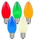 VERSATILE USE: These powerful and durable bulbs are just what you need for wedding decor, Christmas celebrations, weekend BBQ's and so much more! Spruce up your patio with these classic party lights that will be sure to brighten up your space! MULTIPLE POWER SETTINGS: Our glass-made dimmable replacement bulb will illuminate all indoor/outdoor space. Spice up your lighting and scenery to set the mood. From wedding decorations to bedroom essentials, these lights will illuminate your needs! APPLICATION: Screw in these replacement bulbs to unlock their brightness! Create the best mood for a variety of events and celebrations by illuminating your outdoor space with an elegant warm ambiance. DIMENSIONS & DETAILS: These nickel coated E12 Base 5 Watt 130 Volt bulbs are 2-1/4" tall by 1" wide and fully dimmable. With the 3,000 hour lifespan and adjustable brightness, you can create customized ambient lighting for all your events! OUR MISSION: At Novelty Lights, we pride ourselves in being string light experts, bringing you high quality LED Christmas lights, fairy lights, outdoor string lights, twinkling lights, replacement bulbs, and more at budget-friendly prices. Product Description C7 Replacement Christmas Light Bulbs Traditional Retro Bulbs Our 25-Pack of C7 ceramic replacement lamps are perfect for decoration of your house or business for the Christmas season. Our C7 bulbs have a candelabra base (e12) and measure 2-1/4" tall and 1" wide. Stringers Sold Separately Use with our C7 Stringers, Heavy Duty Candelabra (e12) Stringers, Vintage e12 Twisted Wire Strings with Bakelight Sockets or bulk C7 spools for all your Christmas lighting applications. Applications Use our traditional C7 ceramic opaque replacement bulbs for your decorations needs. Some applications include: Christmas, roofline string lighting, weddings, restaurants, patio, special event tents, Christmas trees, and more. C7 Replacement Bulb Specifications 25 Bulbs 3000 Hour Bulb Life 5 Watt 120 Volt C7/E12 Candelabra Base Nickel Coated Base Bulb Size: 2-1/4" Tall by 1" Wide Roofline Decoration Christmas Tree Decoration Traditional Christmas Bulbs C7 Bulb Measurements