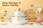 Healthy Ceramic Cookware Sets - SGS approved. Non-toxic, free of PTFE, PFAS, PFOA, PFOS, APEO, lead, cadmium and other toxic substances that can leach into food. Naturall Nonstick - Ceramic non-stick is healthier and scratch-resistant with excellent food release. Only less oil is needed for cooking, for a healthy, low-fat diet. 14 Piece Pots and Pans Set Includes - 8 & 9.5 inch frying pan set, 12inch/5Qt saute pan with lid, 6.5Qt casserole with lid, 2Qt saucepan with lid, 2pcs multi-purpose utensils, 4pcs pot protectors. Induction Compatible - 4.8mm thick stainless steel pan bottom makes this cookware set suitable for all stovetops. Die-cast aluminum construction allows the pan to heat up quickly and evenly, keeping the heat consistent. No warping and durable. Easy to Clean - Simply wipe with a paper towel or rinse with water, hand washing is recommended as it cleans effortlessly. Stay-Cool Handle & Glass Lid - The anti-scald wood-grain Bakelite handle is ergonomically designed for comfort and ease of handling. The explosion-proof glass lid prevents splashing and ensures maximum visibility. Product Description Why Choose Sensarte Ceramic Cookware Sets? SAFE & HEALTHY - Natural ceramic surface , 100% free of PTFE, PFAS, PFOA, PFOS, APEO, lead, cadmium, and other heavy metals. Healthier than Teflon coated pans. PREMIUM CORROSION RESISTANCE - Harder surface and stronger adhesion provide a stronger barrier for better protection of pans. HIGH HEAT RESISTANCE - Performs well in thermal shock tests. Does not produce toxic fumes even when overheated. LONG LASTING DURABILITY - Scratch-resistant, abrasion-resistant, maintains good non-stick performance even after years of use. EASY TO CLEAN - Rivet-free design and premium non-stick technology make cleaning a breeze. DIE-CAST CONSTRUCTION- Heavy duty, strong and durable, no warping. Stands up to daily use. SPACE SAVING - Stacks and hangs to save space. 1 Perfect Food Release 2 Easy to Clean 3 Space Saving 1 12in/5Qt Saute Pan w/ Lid 2 6.5 Qt Casserole w/ Lid 3 8 & 9.5 Inch Fring Pan 4 2 Qt Sauce Pan w/ Lid 5 Utensil & Pan Protectors 1 What's Included 2 12" saute pan & Stock Pan 3 8" & 9.5" Frying Pan 4 2Qt Saucepan & Utensil 1 Anti-scald Handles 2 Suitable For All Stoves 3 Explosion-Proof Glass Lid 4 Thoughtful Helper