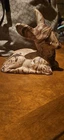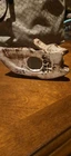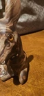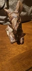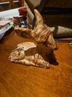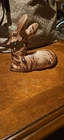 This beautiful ceramic figurine depicts a deer lying down, with a swirled brown design and gold eyes. Handmade in the United States in 1980, this piece is a wonderful addition to any collection. The deer's graceful appearance is captured perfectly in this figurine, making it a great decoration for any room. Crafted with care, this deer figurine is sure to impress. Its intricate details and unique design make it a must-have for collectors. Add it to your collection today and enjoy its beauty for years to come. There is some paint loss as shown. Will be very easy to touch up. Perfect for Christmas decor!
