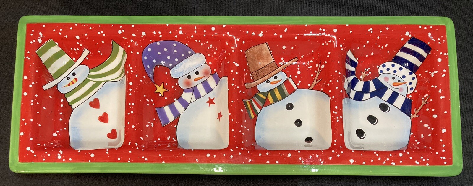 This festive 4-section snowman candy/serving dish by Certified International measures 18.75 inches in length, 7 inches in width, and 1.5 inches in height. The item is pre-owned and comes in good, clean condition with no chips, cracks, or breaks. Please see pictures for complete details. If you have any questions or concerns, please do not hesitate to contact us. Check out our other items and message us if interested in more than one listing as combining items could save you money on shipping. RETURNS & REFUNDS Please inspect your item as soon as it arrives. We stand by the quality of the items we sell and will issue a full refund, including shipping charges, on any defective item that is returned. Please note: photos of the item, packaging, serial numbers and/or product identifiers may be required in order to guarantee a full refund. Returns are accepted on non-defective items; however, shipping charges will be withheld from your refund.