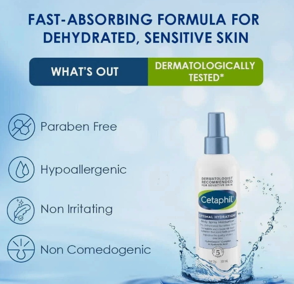 Lightweight body spray moisturizer with HydroSensitiv Complex plus hylauronic acid, sunflower seed oil. and vitamins B5 & E to deepen hydration to soothe and replenish dry dehydrated sensitive skin for 48 hrs. Fragrance Free, Paraben free