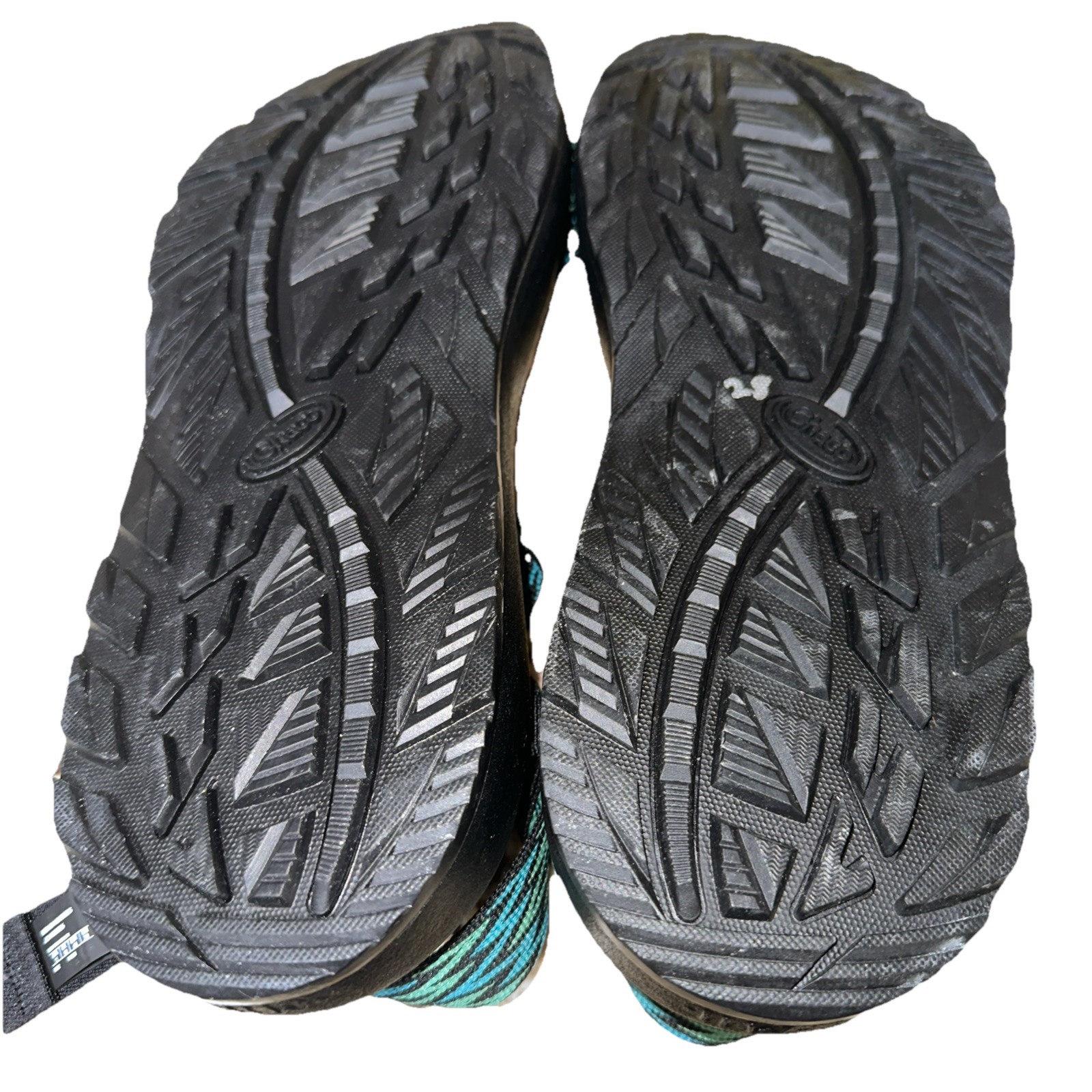 The Chaco JCH108685 Men's Strappy Green Black Blue Adjustable Hiking Sandals are a versatile and stylish option for outdoor activities and casual wear. Featuring a geometric blue pattern with the Chaco logo accent, these sandals are designed for comfort with arch support and an adjustable ankle strap. Made with a textile upper and a rubber outsole, they are perfect for summer, fall, and spring adventures. The strappy style and durable construction make these sandals a reliable choice for travel and active pursuits. Please check photos for more details. (Ref #14 green tub sandal /11)