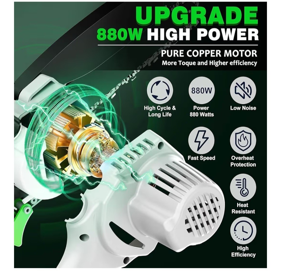 Power SourceBattery Powered Horsepower880 Item Weight0.9 Kilograms Product Dimensions7"L x 4.3"W x 13"H Chain Length6 Inches ✔【Upgraded High-Efficiency Pure Copper Super Motor】Ceepuy 6-inch cordless mini chainsaw boasts an 880-watt high-power motor. 28.6 FT/s high speed can efficiently cut a 6-inch diameter log in just 8 seconds, significantly reducing cutting time. Ideal for both home and work, it effortlessly fells common trees or large logs with ease and efficiency. ✔【Auto Oil Filling System】The Ceepuy mini cordless chainsaw features an Auto Oil Filling System, compatible with all brands of oil. Fill the tank with oil, and with a simple press, you can effortlessly lubricate the chain, This system not only reduces wear and tear for smoother cutting, but also increases the number of cuts with less energy use. A single oil fill lasts all day, eliminating the need to carry around a heavy bottle of lubricating oil! ✔【Lightweight,Portable & Female Friendly】The Ceepuy mini chainsaw is designed with a lightweight and portable slim body, making it easy to control with one hand and access to narrow areas. Its compact design is a great fit for the elderly and women. the fully charged battery ensures long-term use without causing strain on the wrist or arm. You can confidently trim those hard-to-reach branches from a ladder, enjoying a balanced and stable cutting experience without any wobbles. ✔【Rechargeable Large Capacity & Long Life Battery Pack】The Ceepuy mini electric chainsaw is equipped with 1pcs 21V 2000mAh high-energy lithium battery pack that's removable and rechargeable. The battery's overload protection and temperature control system are designed to maximize lifespan. They can be charged and work efficiently at any time, offering convenience and speed. ✔【5 Security & Safety Protection】1: It includes a safety lock button that requires simultaneous activation with the start button to prevent accidental operation. 2: A rotatable top protective baffle to minimize wood chip scattering. 3: Protective goggles are provided to shield your eyes from flying sawdust. 4: Anti-cut gloves are provided for hand protection. 5: an anti-slip rubber handle ensures maximum grip and comfort, enhancing control and safety during operation. 【What's in the box - Easy Install & Multiple Accessories】1 x Cordless Mini Chainsaw, 1 x 21V 2000mAh Batteries, 1x Quality Chains ( has been mounted on the chainsaw), 1 x Chain Guide Bar(has been mounted on the chainsaw)1 x Guide Plate Protection Case, 1 x Quick Charger (FCC Certified) , 1 x Screwdriver, 1 x Cleaning Brush, 1 x Safety Gloves, 1 x Goggles, 1 x Empty Oil Bottle, 1 x Instruction Manual-[Tips: 1. The product list includes small oil bottles, but does not include lubricating oil. 2. The product list only includes Black paper boxes and does not include black plastic boxes] Christmas gift Birthday Gift Newyear gift Thanksgiving gifts valentine gift