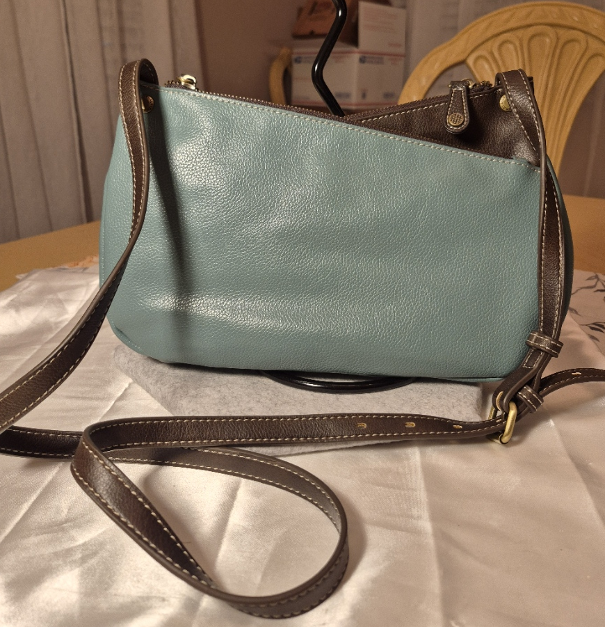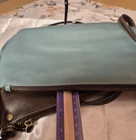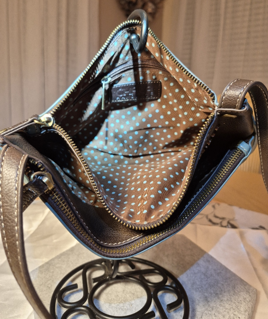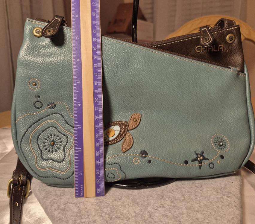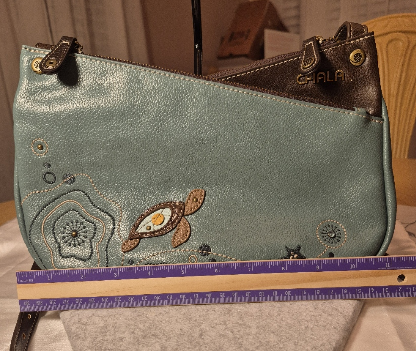 This is a pre-owned Chala Turtle Deluxe Crossbody bag in excellent condition and made from vegan leather. The bag has a teal exterior with brown accents and a playful turtle appliqué, and its interior is lined with brown and white polka dot material. It offers adjustable and detachable straps for versatile wear, multiple pockets for organization, and unique, detailed stitching. Measurements are 12" wide by 7.5" high by 1.25" deep, with a strap adjustable from 25" to 29". Beautiful, fun eco-friendly crossbody bag. Thank you for visiting.