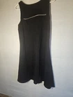 This black trapecae dress made by Chalet is the perfect addition to any wardrobe. It features a round neckline, sleeveless design, and pullover closure. The knee-length dress is made of a combination of spandex, cotton, and modal, making it both comfortable and stylish. The dress has accents of a zipper and side slits, along with stretch material for added comfort. It is suitable for various occasions such as travel, weddings, casual events, formal events, workwear, and business meetings. This dress is machine washable and made in the United States. Dress is in great condition. Ir has a zipper that goes horizontally across the back. Very soft From a pet and smoke free home.