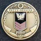 Navy Petty Officer First Class Challenge Coin Specifications: · Composition: Metal Alloy / Antique Brass Finish · Diameter: 40mm (1-9/16") · Thickness: 3mm · Weight: ±30g · Comes in removable clear case ENGRAVING: Send us your engraving details but please note, engraving space is limited and the more letters, the smaller the font. We will make a recommendation if we feel there are too many characters. Please monitor your messages/emails. We have many other coins, creeds and personalized military wall art listed including, Special Forces, Ranger, Airborne, Infantry, etc. Check our store listings.