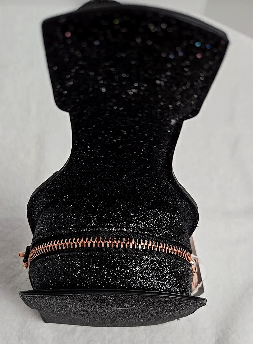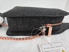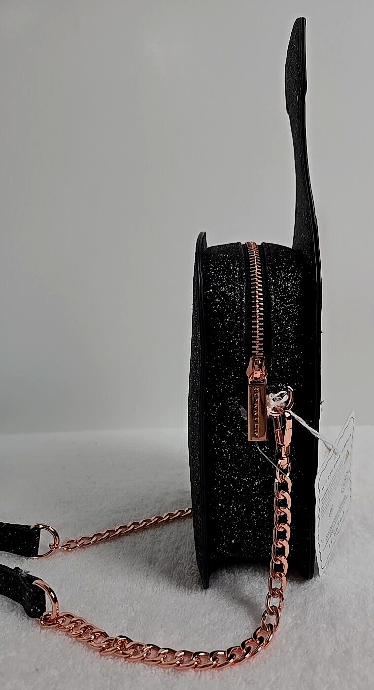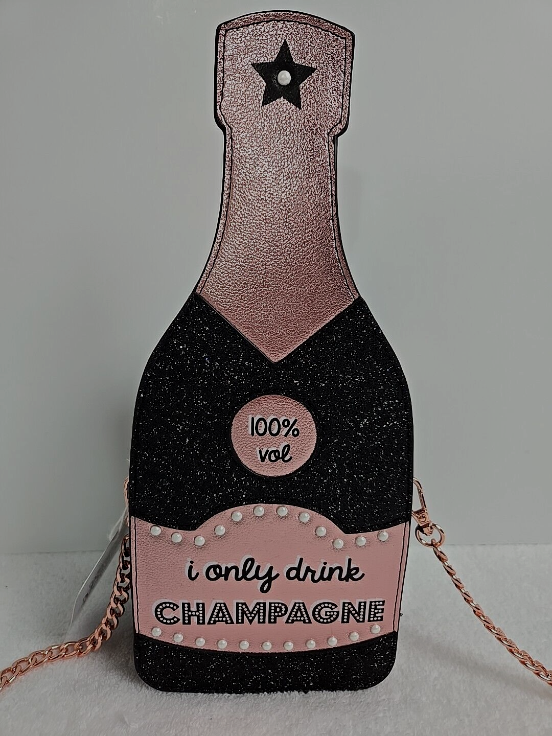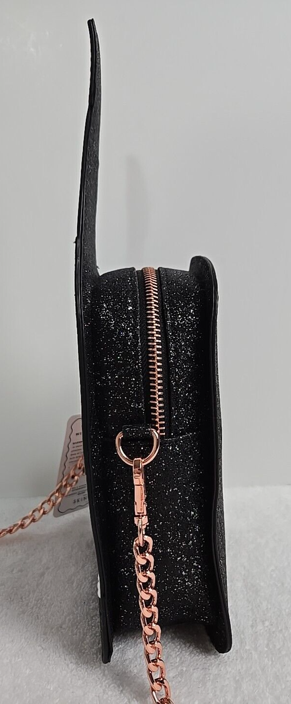 Skinny Dip Bag Champagne Bottle “I Only Drink Champagne” Crossbody New with Tags Skinny Dip London brand. This crossbody purse is in the shape of a champagne bottle Black glitter with rose gold accents. It says "I Only Drink Champagne" in black and white letters on the front accented with faux pearls. Has a main open center lined with black material. Has rose gold hardware and a removable gold chain & black glitter shoulder strap. Top zip closure. Bag Width: 5 in across the top Bag Height: 12 in Bag Depth: 2 in. Strap drop 22 in Useable purse space 7" tall x 4.5" x 2". Please see photos for conditions and measurements. If you have any questions about the product, please feel free to contact me. This product comes from a pet/ smoke free home. Thanks for looking!