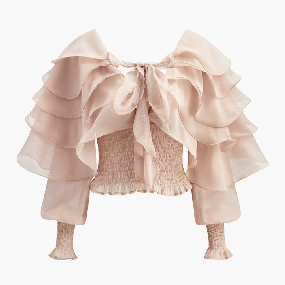 8Elevate your style with this elegant cream ruffled blouse. Perfect for any occasion, this top offers a sophisticated look with its layered design. A must-have addition to your wardrobe.