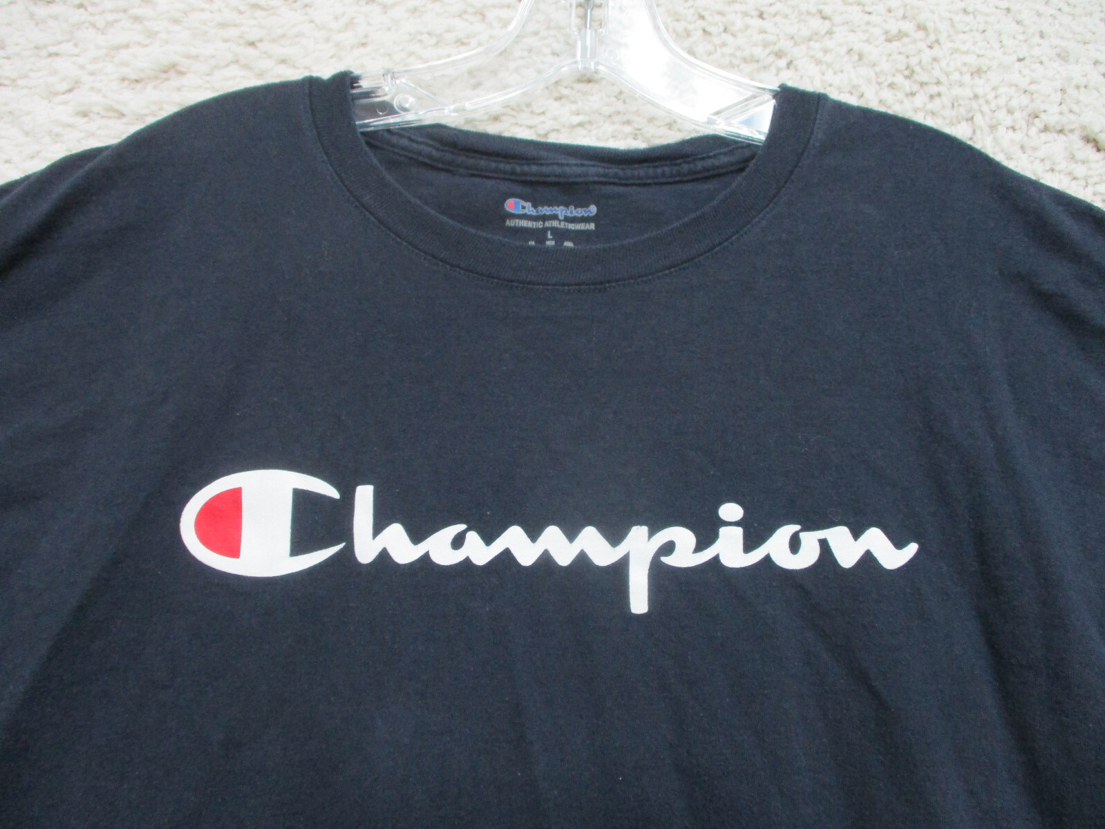 Brand: Champion Fabric Type: Knit Size Type: Regular Type: T-Shirt Theme: Logo, Modern, Sports Size: L Country/Region of Manufacture: China Material: Cotton Features: All Seasons, Easy Care Color: Blue Sleeve Length: Short Sleeve Fit: Classic Pattern: Solid Accents: Logo Neckline: Crew Neck Department: Men Season: Fall, Spring, Summer, Winter Seller Notes: “Very Good Used Condition. Please, See Pictures for Full Condition and Measurements.”