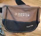 The Champion Shell Bag is a clay target shooting accessory made of canvas. It features the Federal Premium Ammunition logo embroidered on the bag, indicating its quality and association with premium ammunition brands. This bag is designed specifically for shotguns and is suitable for shooting sports activities.