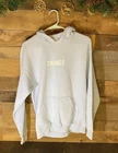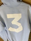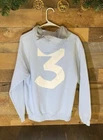This is a Chance The Rapper heavy weight hoodie in size medium, featuring a double-sided logo graphic print on a blue cotton blend fabric. The pullover hoodie has a hood, long sleeves, pockets, and is breathable for wear in winter, summer, fall, or spring. It is part of the Chance 3 Coloring Book Tour collection, representing Chicago and hip hop themes.