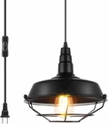 Durable Braided Cord: With 15Ft braided cord, this pendant light is perfect long and durable for party or outdoor events.The distance between ON/OFF switch and plug is 3.05 ft. UL Standard Plug: The plug and wire of this hanging lamp comply with UL standard which is compatible with American wall outlets/Jacks. Height Adjustable:The height of this ceiling light can be adjusted by fixing a supporting point (not included) so that you can create your own style of decoration. Easy Installation: Install a compatible E26 socket incandescent or halogen bulb (60W max) then plug in directly using the switch to turn the swag light on or off.Note:bulbs are not included.Suggested Space Size: 8-12sqm. Vintage Design with Classic Texture:Edison Copper lighting holder and oval glass shade present a rustic retro style lamp.Suitable lighting for barn,farmhouse,hallway,kitchen island,bar counter,dining room or bedroom. Product Description EE ELEVEN MASTER Provides the professional yet optimized solution of lightings for your home decoration! ELEVEN MASTER PENDANT LIGHTS Durable Braided Cord--With 15Ft Durable Braided Cord, this pendant light is perfect long and durable for party or outdoor events.The distance between ON/OFF switch and plug is 3.2 ft. UL Standard Plug--The plug and wire of this hanging lamp comply with UL standard which is compatible with American wall outlets/Jacks. Height Adjustable--The height of this ceiling light can be adjusted by fixing a supporting point (not included) so that you can create your own style of decoration. Easy Installation--Install a compatible E26 socket incandescent or halogen bulb (60W max) then plug in directly using the switch to turn the swag light on or off.Note:bulbs are not included.Suggested Space Size: 8-12sqm. Vintage Design with Classic Texture--Edison lighting holder and oval metal cage shade present a rustic retro style lamp.Suitable lighting for barn,farmhouse,hallway,kitchen island,bar counter,dining room or bedroom. Fixtures Color: Black Material: Strong Iron Light Direction: Down Lights Bulb Type: E26 Base Incandescent, Halogen, LED Bulbs(40W max, bulb not included) Voltage: AC120V. Wattage: Max 60W Power Source: Plug In Suitable Indoor use only Height Adjustable Length of Cord: 15 ft. Distance between plug and switch:3.2ft