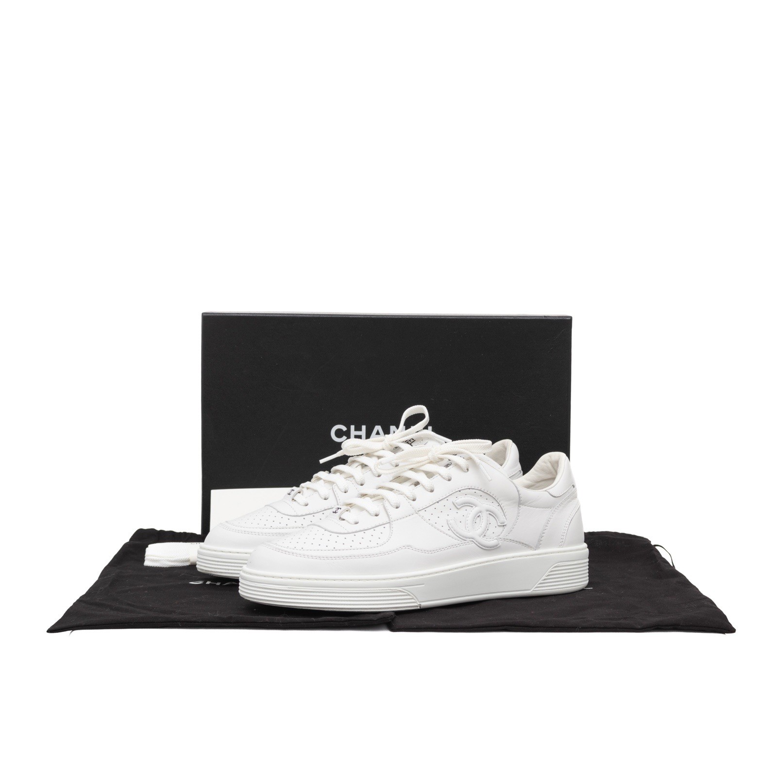 Chanel 23A White Calfskin CC Logo Tie Flat Runner Trainer Sneaker Mens ~~ 8 US - Size US 10B ; EU 42 ~~ US 8 Mens - 8/10 Good Preowned Condition - 100% Authentic - 100% Calfskin Leather - Lining Leather - Rubber Sole - Leather Insoles - Made in Italy - Art : W G45079 - Collection 2023 - Chanel Logo On The Side - Perfect Perforation - Branded Tongue - Hot Stamped Logos On Sole - Classic Design - Famous Brand - Very Comfortable - And Premium Quality - Minimalistic Design - Beast for Casual Looks