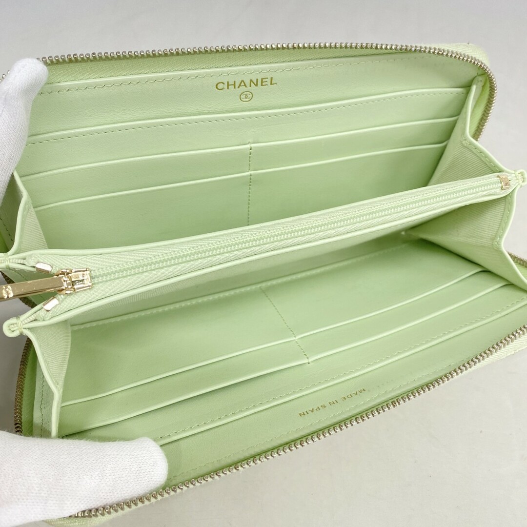 Absolutely love this Chanel wallet—the light green caviar skin is stunning, and the champagne gold hardware adds such a luxurious touch. The matelassé stitching is flawless, and it holds everything I need without being bulky. The seller was super responsive and shipped quickly from Japan. Feels so elegant every time I use it! Highly recommend!