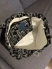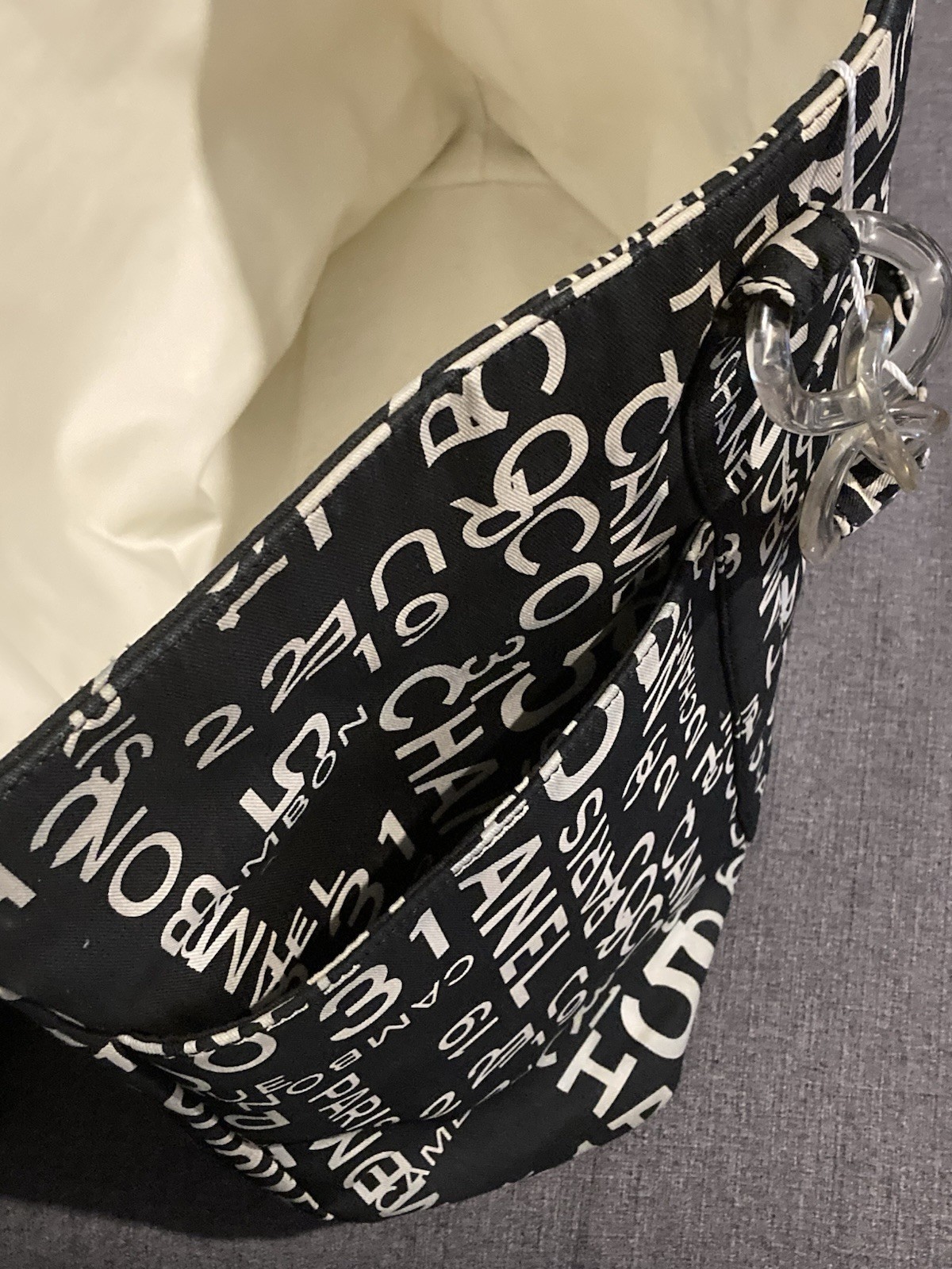 This is an authenticated on eBay CHANEL Canvas 31 Rue Cambon Beach Tote in Black. This chic tote is crafted of black canvas with the print of Chanel 31 Rue Cambon, the Chanel flagship location in Paris, printed in white across the bag. The bag features canvas with clear lacquer links. There is a broad opening to a vanilla interior spacious for ample everyday necessities with the timeless style of Chanel! This specific bag is identified as part of the "Sea Line" collection by Chanel and is characterized by its distinctive plastic chain handles and canvas material. Size Length: 17.50 in Width: 4.50 in Height: 12.00 in Drop: 9.25 in